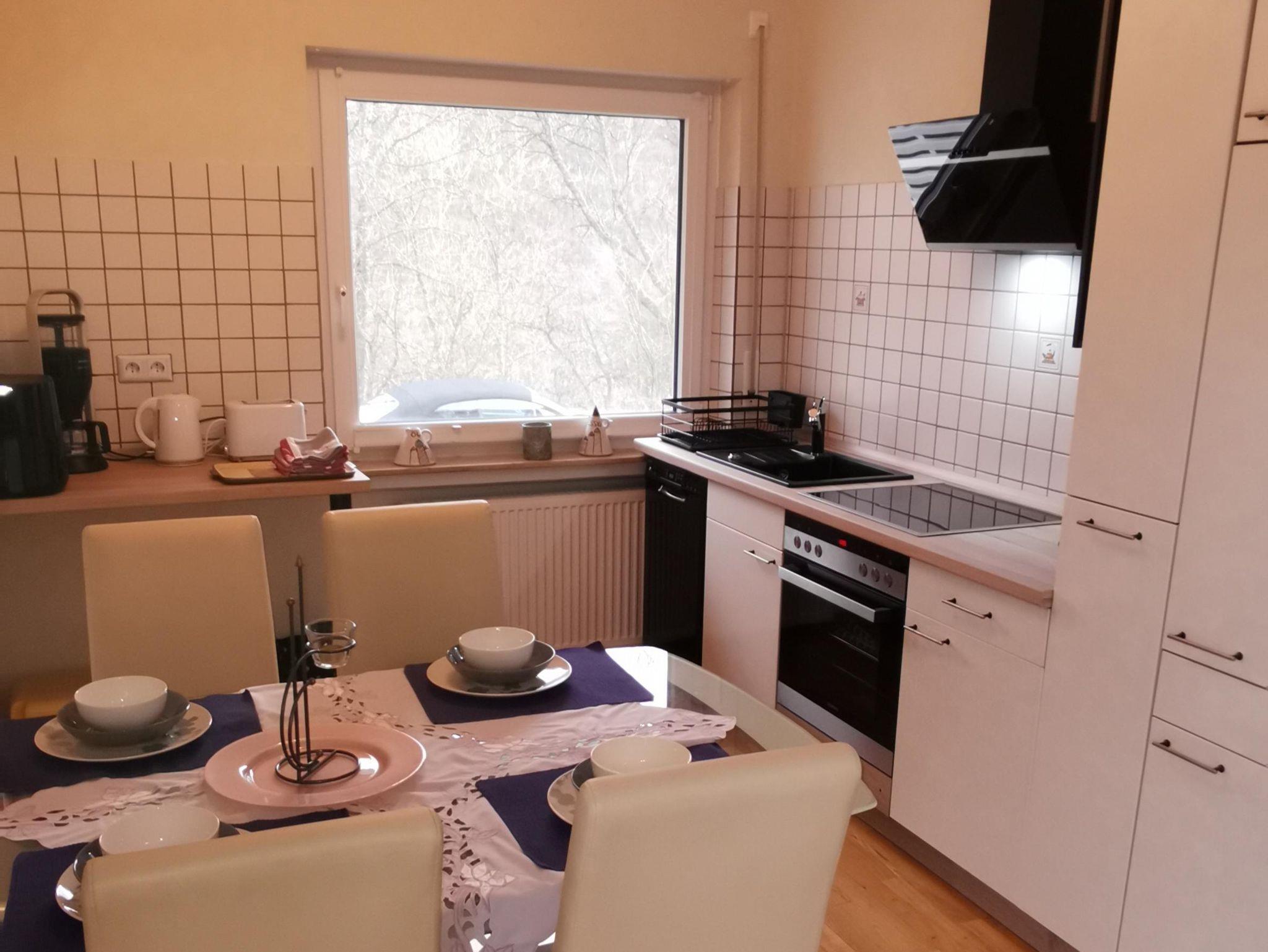 Die Ferienwohnung verfügt über zwei Schlafzimmer, einen Wohn-Essbereich mit Küche sowie ein Badezimmer und eine Gästetoilette. Die Ferienwohnung befindet sich im Erdgeschoss, vier Stufen aufwärts bis zur Haustür, sonst ebennerdig und hat Echtholzparkett sowe Fliesen. Neben der Eingangstür befindet sich ein Gäste WC, daneben ein Schlafzimmer mit Bett, Schrank und Regal. Durch einen Flur mit Garderobe und Spiegel gelangen sie ins Wohn-Esszimmer, dort befindet sich ein Fernseher, Stereoanlage und eine gemütliche Wohnlandschaft, Regale mit Büchern und Spielesammlung. Im gleichen Raum ist der Essbereich mit einem Tisch und vier Stühlen, sowie die Küchenzeile mit einem Kühlschrank/Gefrierfach, Cerankochfeld , Backofen, Spülmaschine, Kaffeemaschine, Wasserkocher und Toaster. Die Küche ist mit dem kompletten Geschirr- und Besteck ausgestattet. Durch die Terrassentür mit großem Fenster gelangen sie auf die eingezäunte Terrasse welche mit Gartenmöbeln und einem Holzkohlegrill ausgestattet ist. Neben dem Wohnzimmer befindet sich das Schlafzimmer mit einem Doppelbett, Schlafsofa und einem Kleiderschrank. Durch das Schlafzimmer gelangen Sie ins Badezimmer mit Dusche, Waschbecken, Spiegelschrtank WC, Waschmaschine und Trockner.