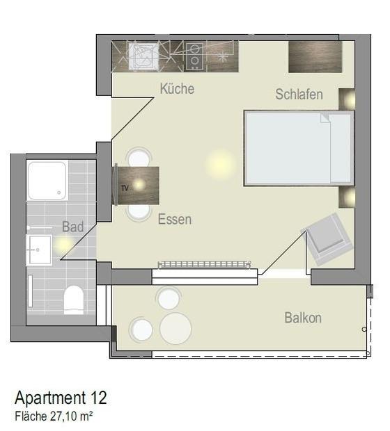 Das 27 m² große Apartment mit einem 1,40 m breiten franz. Doppelbett befindet sich in der 2. Etage. Ein Balkon ist vorhanden. Dieses Apartment bietet Platz für 2 Personen.