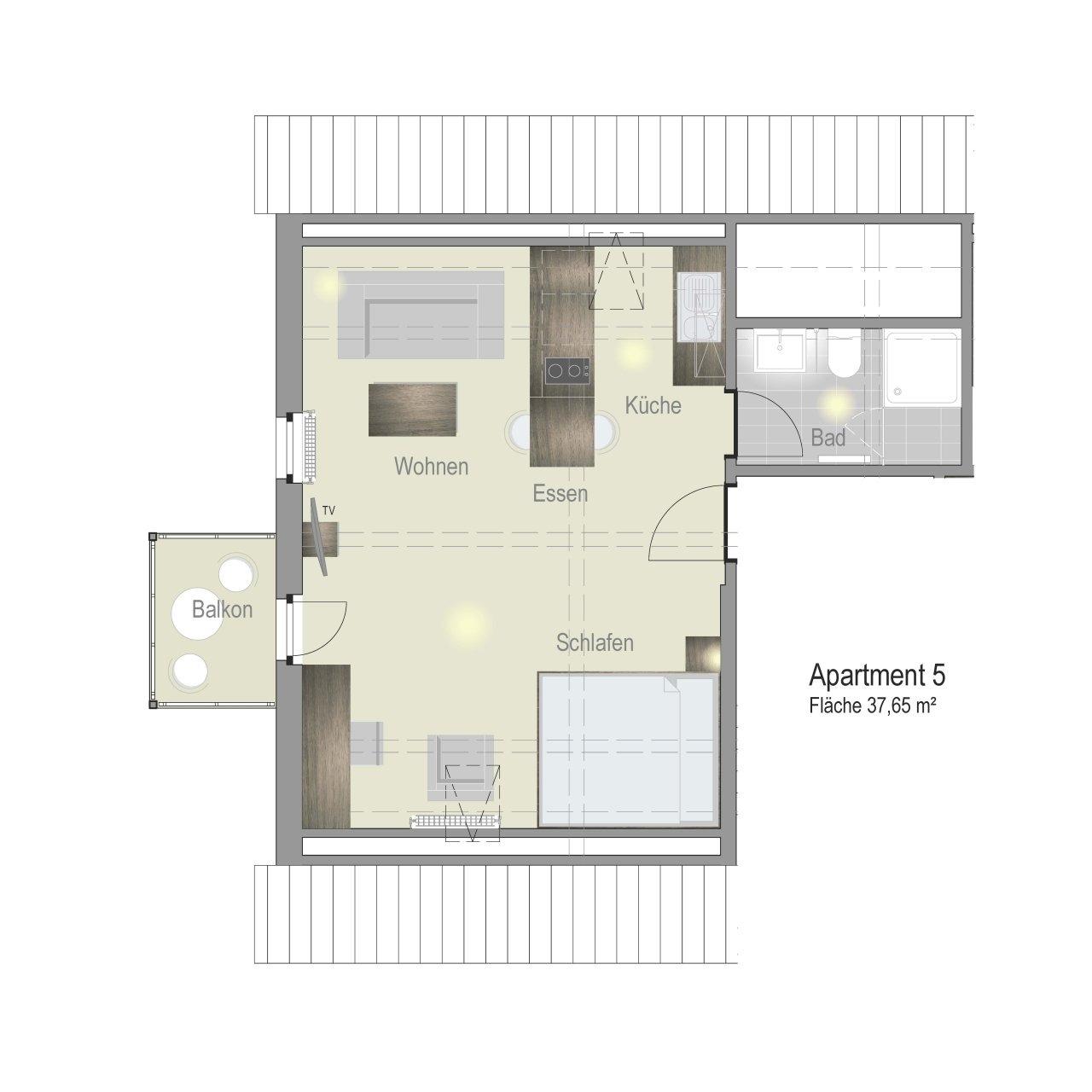 Das geräumige 38 m² große Apartment mit einem 1,80 m breiten Doppelbett befindet sich in der 2. Etage des Bauernhauses. Ein Balkon ist vorhanden. Dieses Apartment bietet Platz für bis zu 3 Personen.