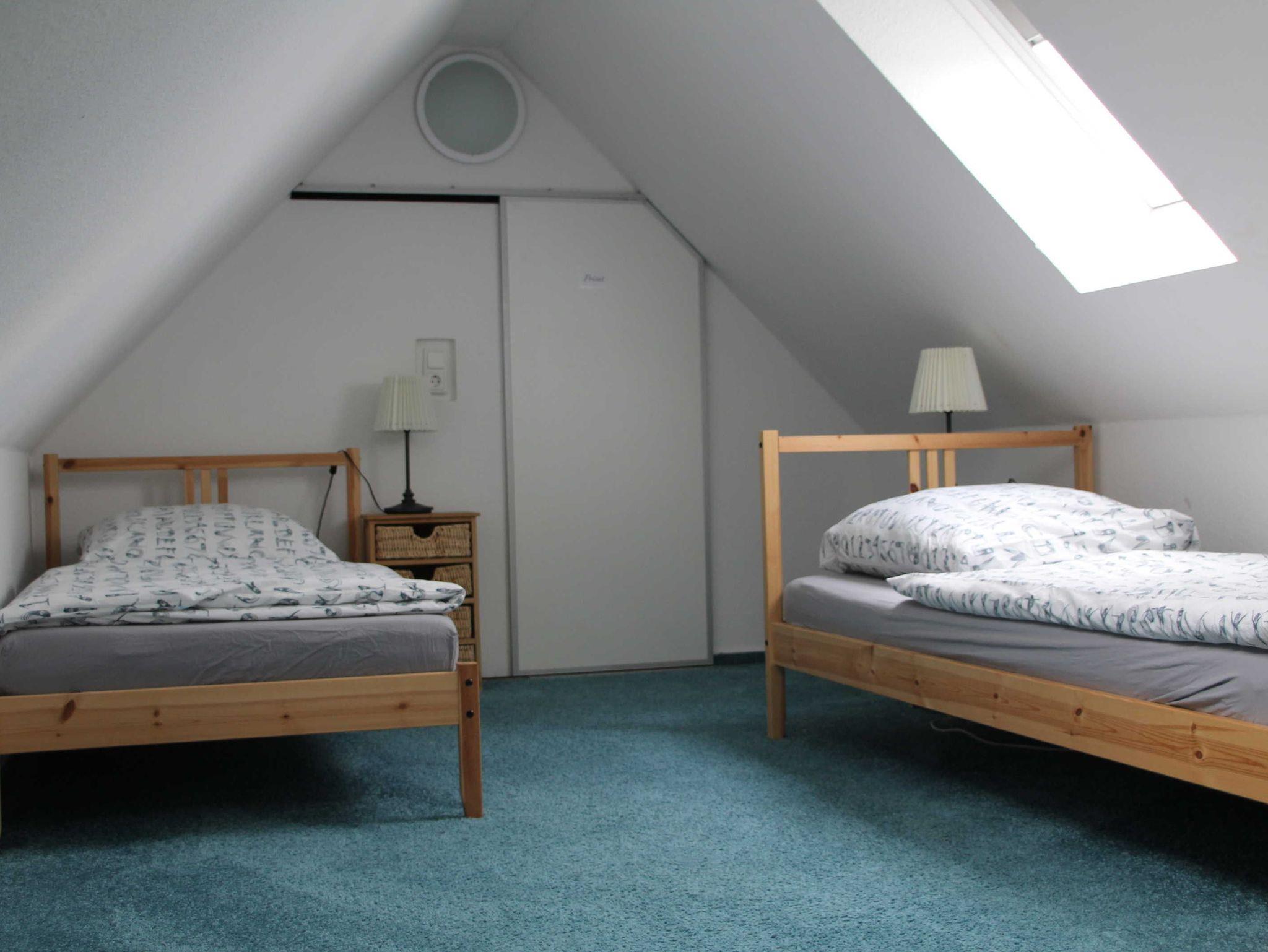 In einem weiteren Zimmer ist eine Leseecke mit zusätzlichem Fernseher, und ein großer Kleiderschrank vorhanden. Von hier aus geht eine feste Treppe ins Dachgeschoss ,wo sich der zweite Schlafbereich befindet. In diesem stehen zwei Einzelbetten.