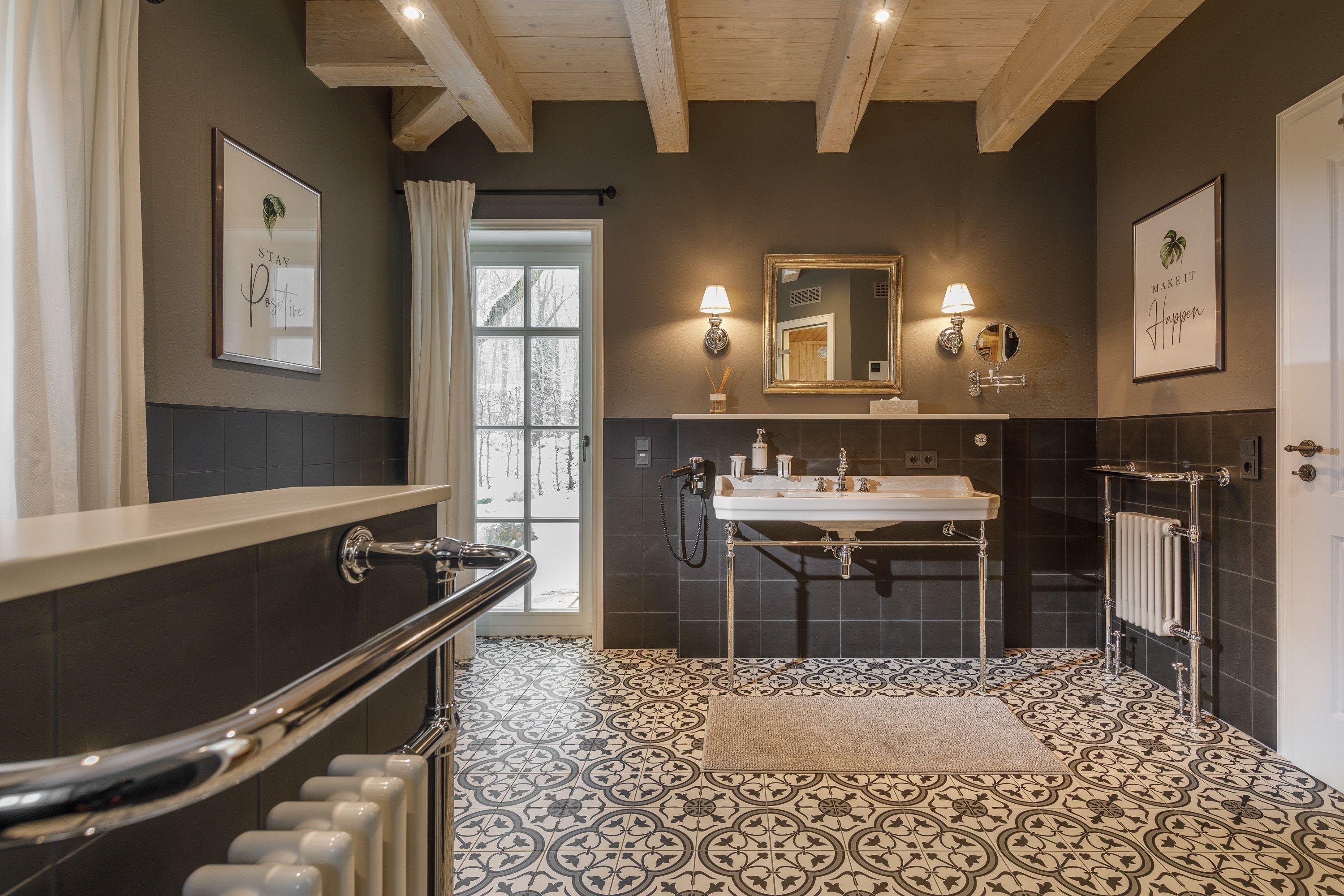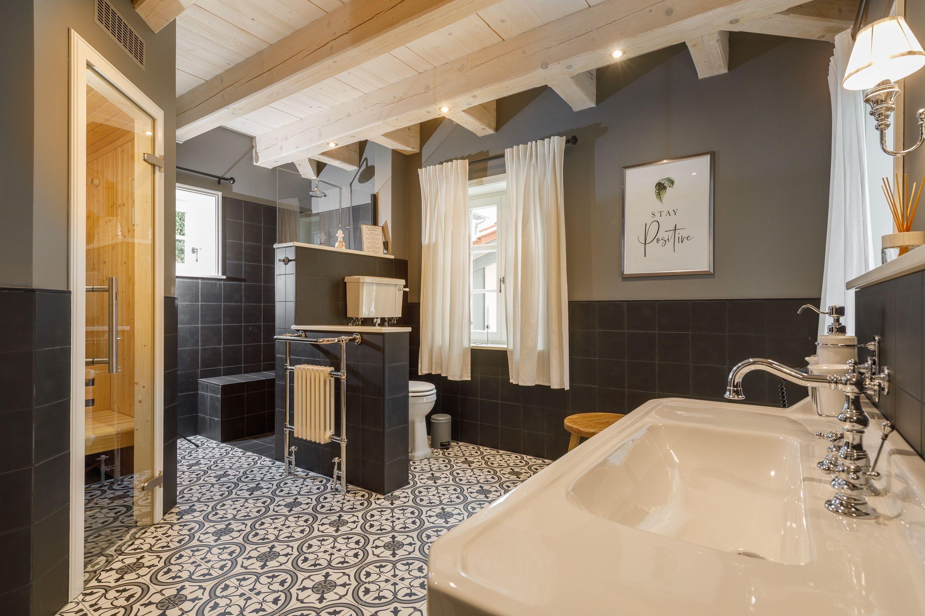 Eigene Sauna mit 4 Badeformen plus Infrarot, 2 Duschbäder mit ebenerdigen Einstieg und WC, Fön, Kosmetikspiegel, Handtuchheizkörper, Fußbodenheizung, Waschmaschine und Wäschetrockner, Bügelbrett und -eisen, Zur Erstausstattung gehören: 2 Handtücher (ein Hand- / Duschtuch pro Person), Saunahandtücher werden bei Bedarf zur Verfügung gestellt., Toilettenpapier, Seife