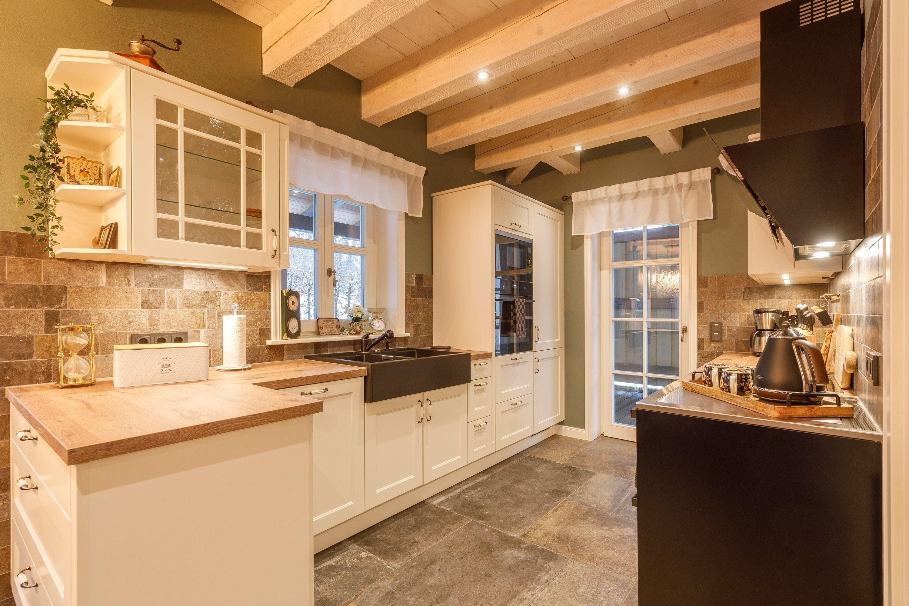 Vollausgestattete Küche plus einer Küchenhexe, Geschirr, Besteck, Kochutensilien, 4 Plattenherd (Ceranfeld), Backofen, Mikrowellengerät, Kühl- / und Gefrierkombination, Geschirrspülmaschine, Toaster, Kaffeemaschine (Filter Größe 4), Wasserkocher, Eierkocher, Mixer und Kuchenbackform, Zur Erstausstattung gehören: Spülmittel, Spülmaschinentab