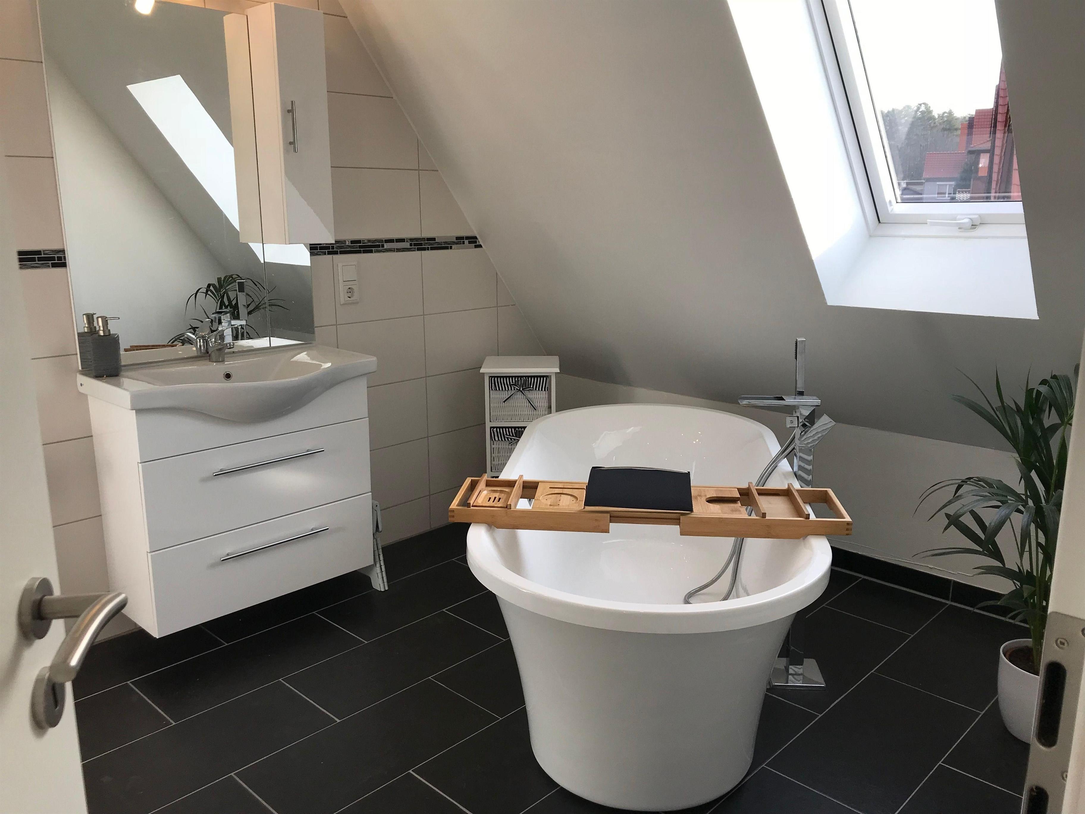 Moderne Ausstattung: Die Unterkunft ist mit TV in jedem Schlafzimmer, Sauna, Waschmaschine und Trockner ausgestattet. Die freistehende Badewanne im Badezimmer sorgt für zusätzlichen Komfort und Entspannung.