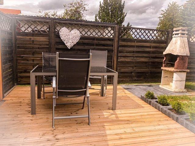 Der Außenbereich des Ferienhauses ist ideal für Gäste, die Ruhe und Natur genießen möchten. Der eingezäunte Garten bietet ausreichend Platz für Hunde, damit sie sicher spielen und herumlaufen können. Eine überdachte Terrasse lädt dazu ein, auch bei weniger schönem Wetter die frische Luft zu genießen, während der Grillbereich perfekt für gesellige Abende mit Familie und Freunden ist.