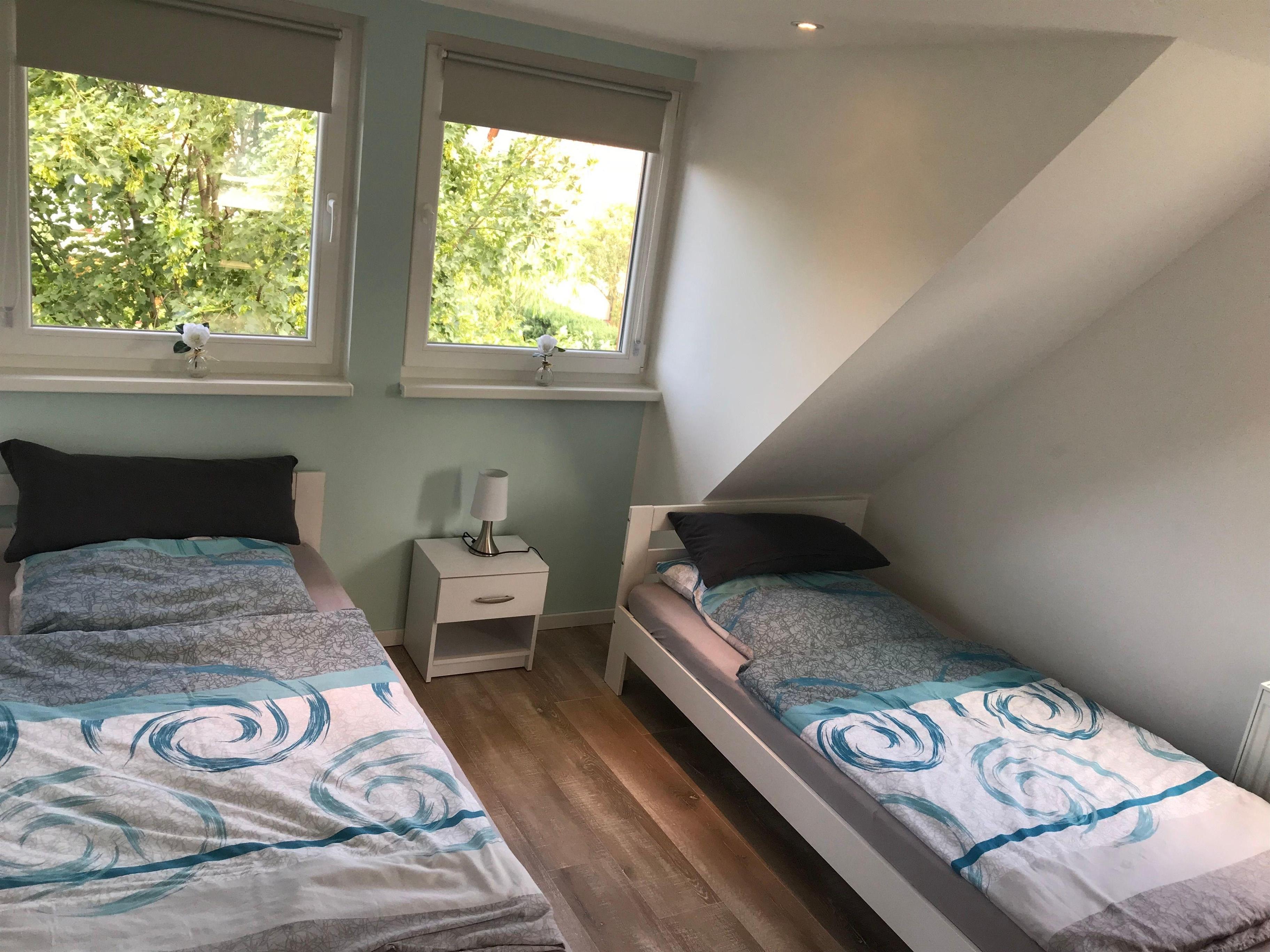 Schlafzimmer 3: Zwei Einzelbetten, Kommode, TV, perfekt für Kinder oder Freunde.