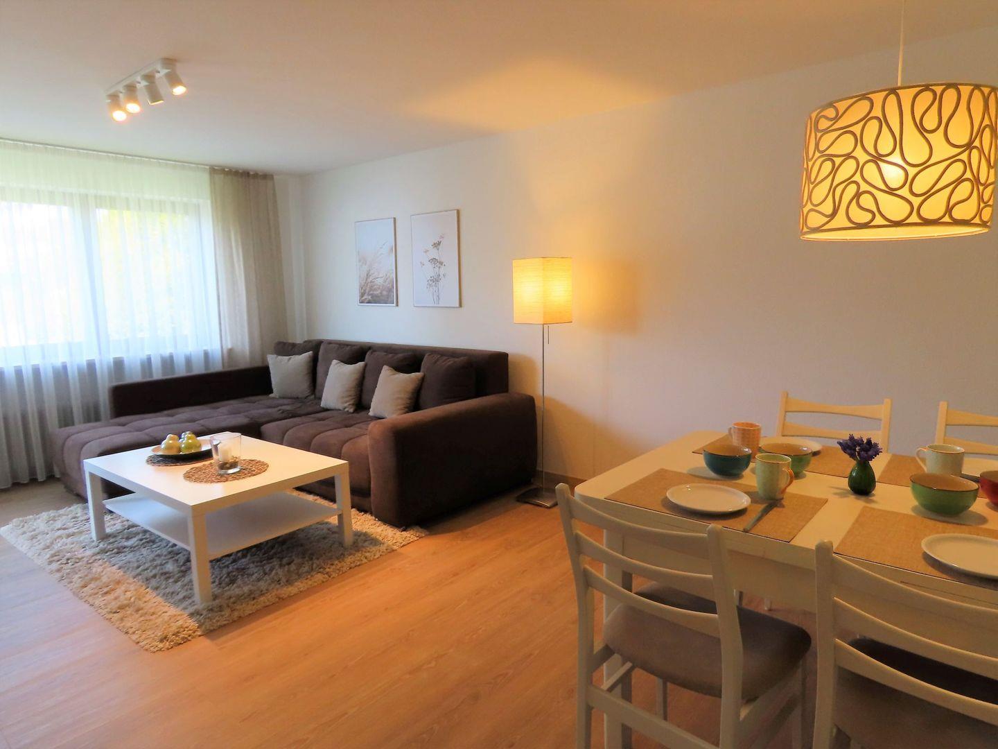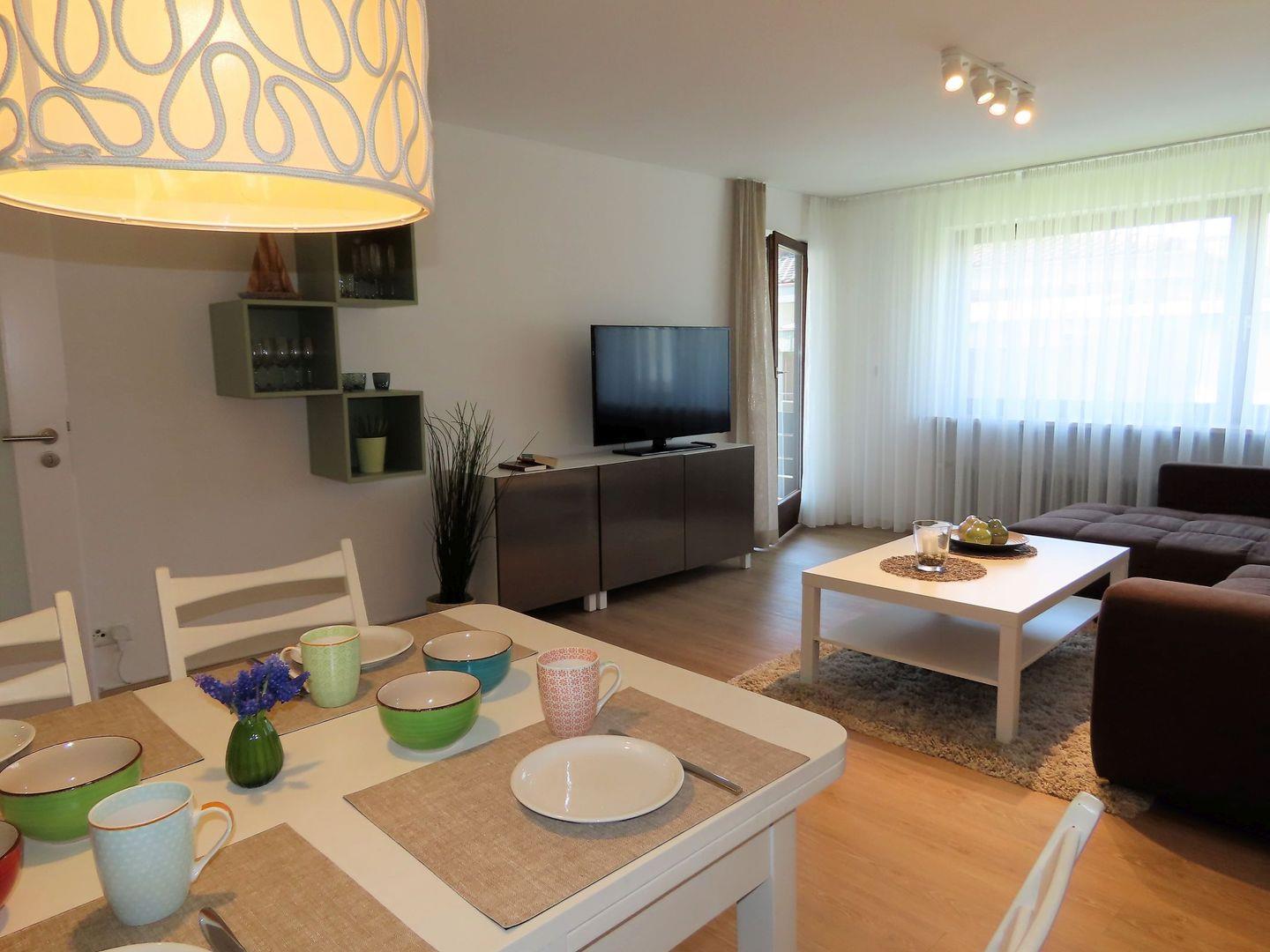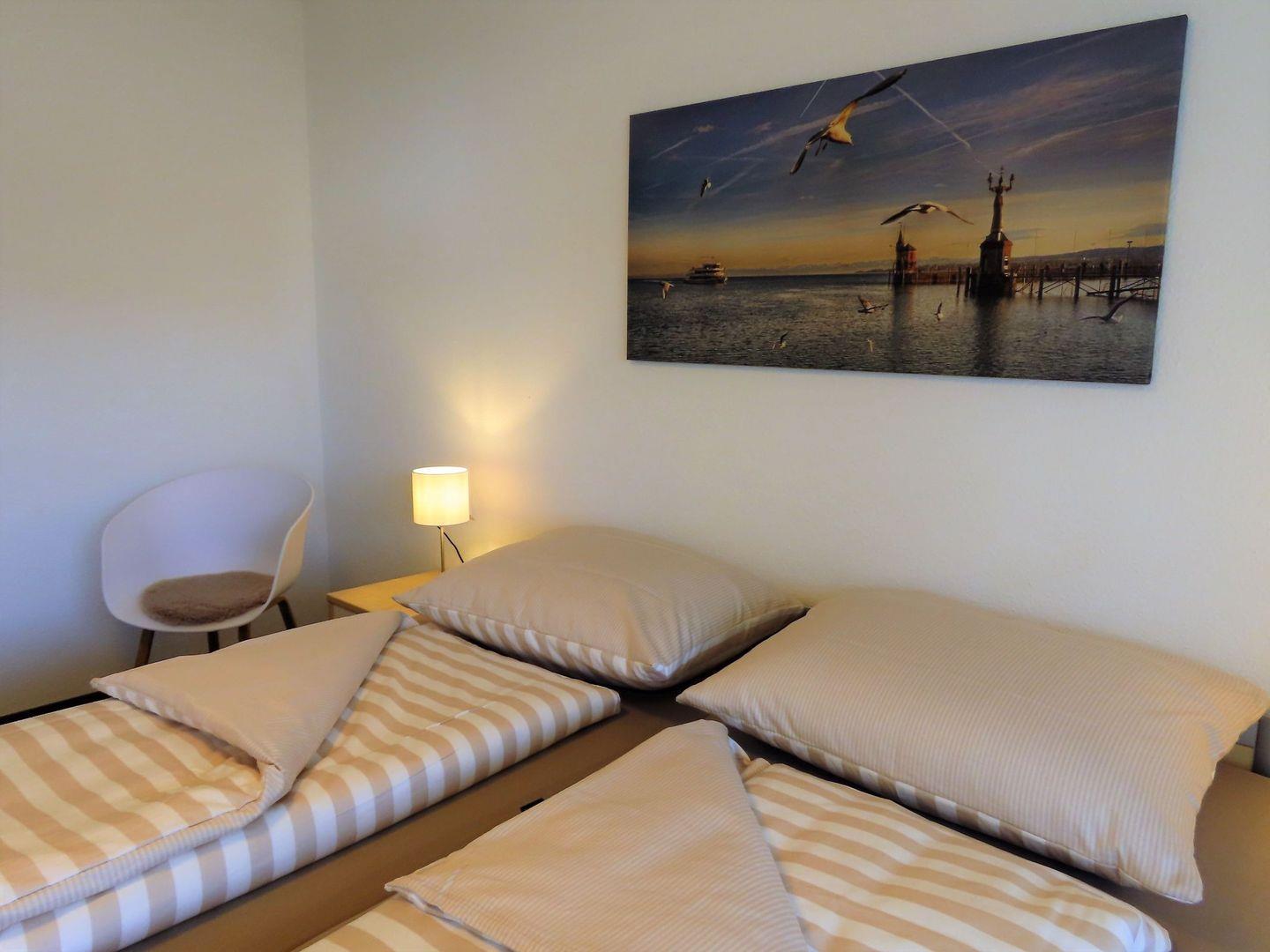 In ruhigen Naturtönen stilvoll eingerichtet, sorgt Ihr Urlaubszuhause für entspannte und erholsame Tage. Highlight ist das idyllische Seegrundstück, das allen Hausgästen offensteht. Mit verschiedenen Sitzgelegenheiten, Liegen und einem Naturkiesstrand. Sie baden in Trinkwasserqualität mit Blick auf die imposanten Schweizer Berge gegenüber. Nach einem erlebnisreichen Tag lässt sich der Abend dort im Sonnenuntergang verbringen oder komfortabel auf dem großzügigen Sofa. Ein zusätzlicher Fernseher befindet sich in einem der Schlafzimmer. Drei neu gestaltete Schlafzimmer bieten ausreichenden Komfort und Stauraum bis zu 4 Personen. Gut frühstücken mit leckeren Brötchen von der Dorfbäckerei, lässt es sich auch auf dem geschützten Balkon mit Teilseesicht. Ihr PKW steht sicher auf dem Grundstück, Ihre Fahrräder in der benachbarten Garage.