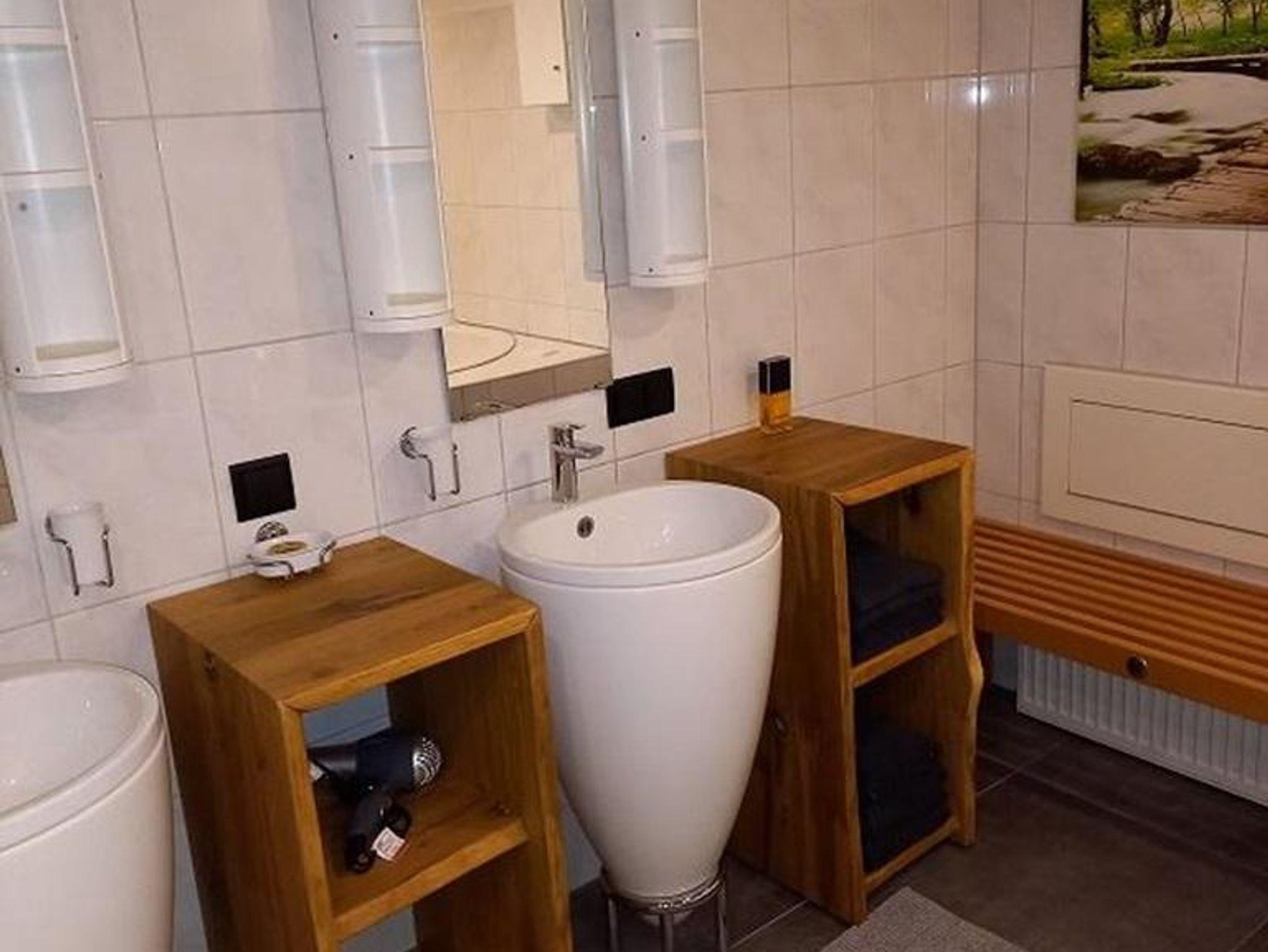 Das Bad mit Wanne (für 2 Personen geeignet, und die Kinder passen auch noch rein) separater Dusche, 2 Waschbecken sowie viel Stauraum, sind sehr groß gestaltet.