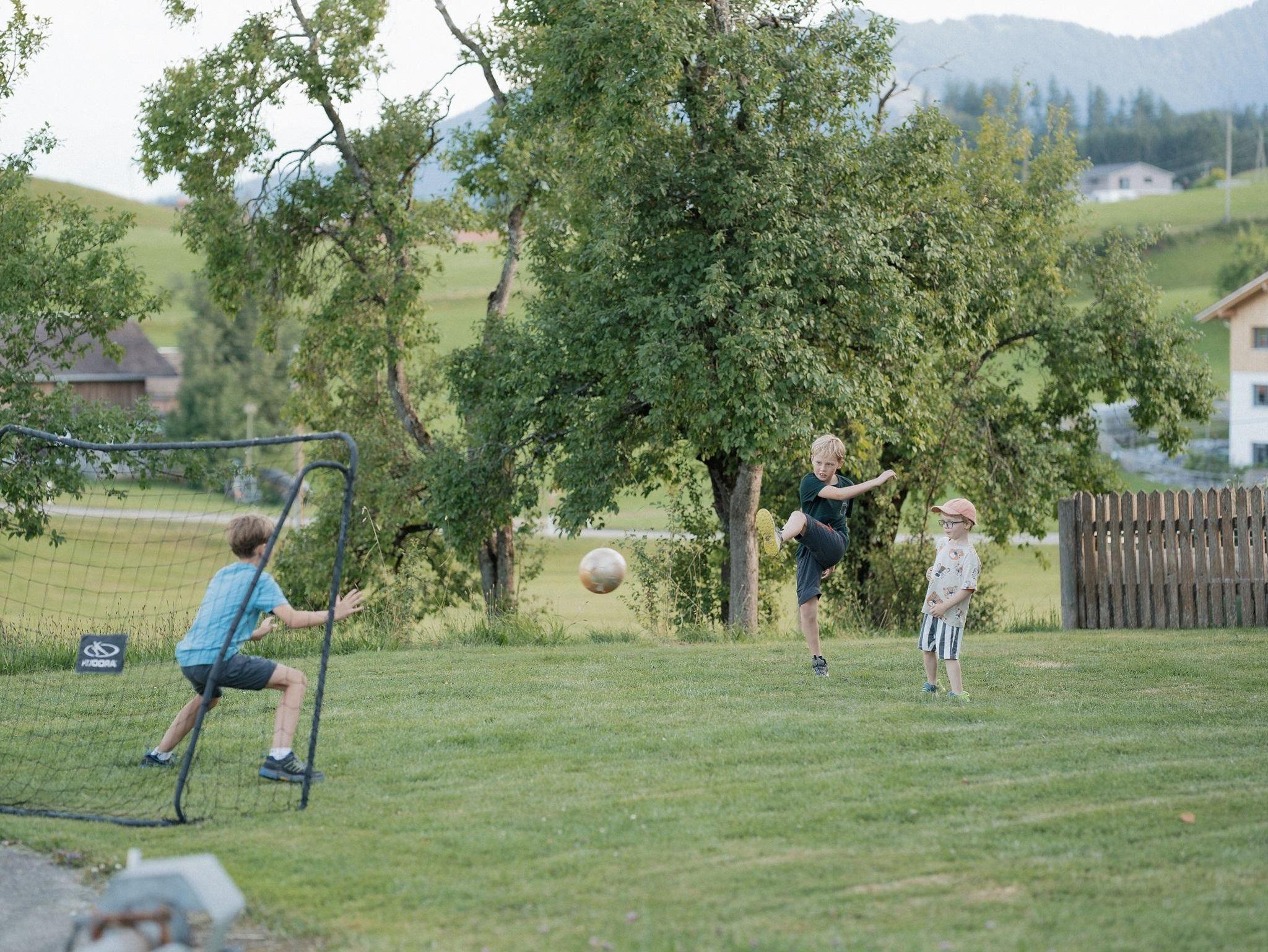 Ob bei einem Spaziergang über die weitläufigen Wiesen oder beim Entspannen im eigenen Garten, der Platz für die ganze Familie lädt zum Verweilen ein. Kinder sind hier herzlich willkommen und können sich auf dem Kinderspielplatz austoben, während Sie in einer der gemütlichen Liegestühle die Seele baumeln lassen. Für die Abenteuerlustigen bieten sich Wanderwege und die Möglichkeit zur Schneeschuhwanderung, um die Umgebung aktiv zu erkunden.