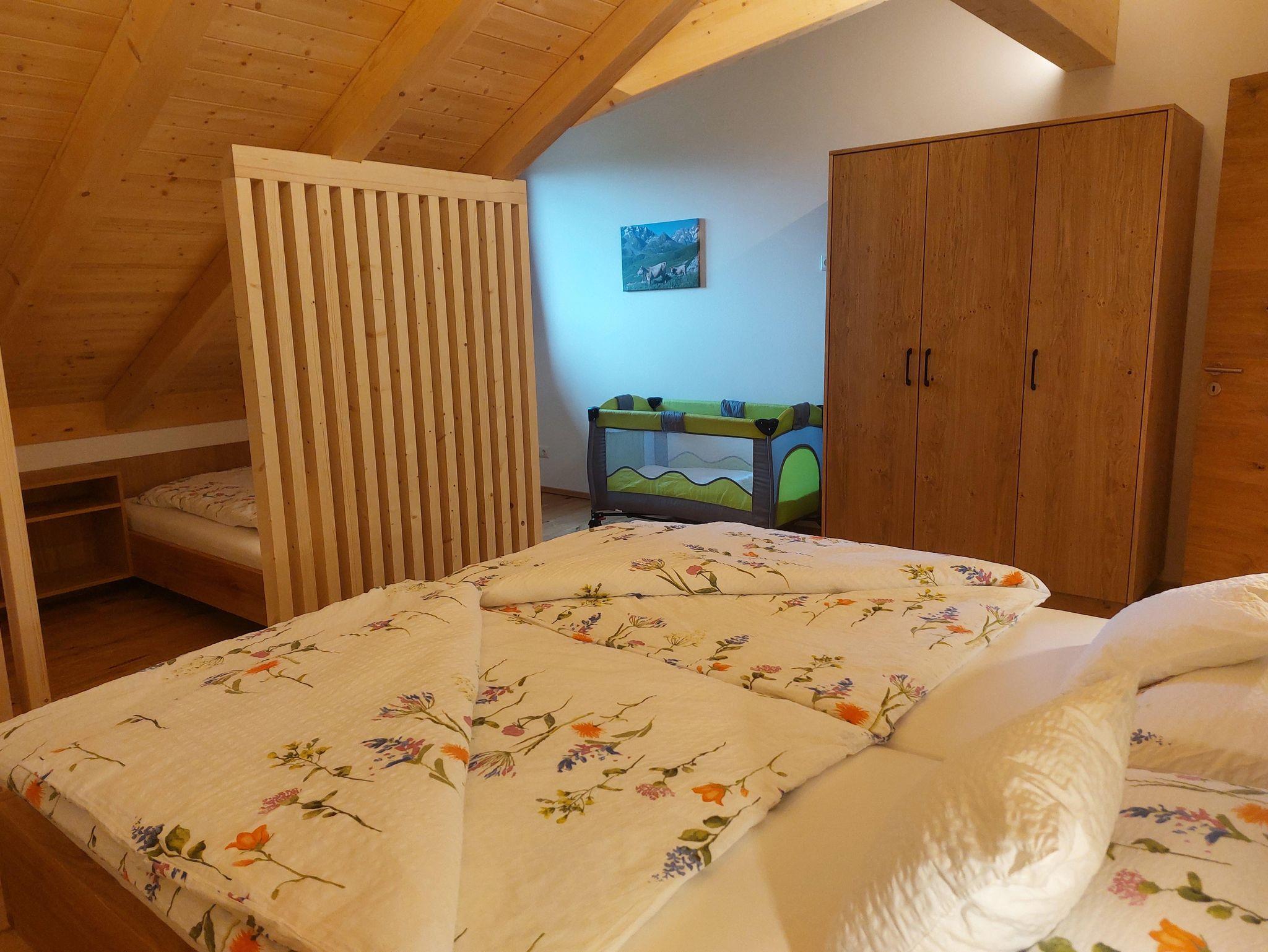 • Familienschlafzimmer mit rustikalen Betten in naturbelassener Eiche (getrennte Matratzen und Fußende offen 180 x 200) & zwei Einzelbetten (90x200)