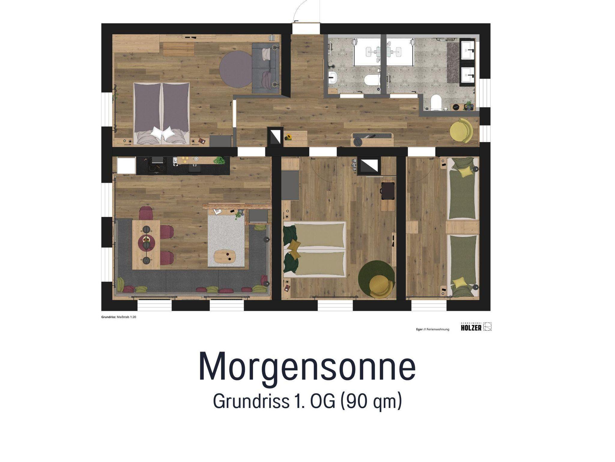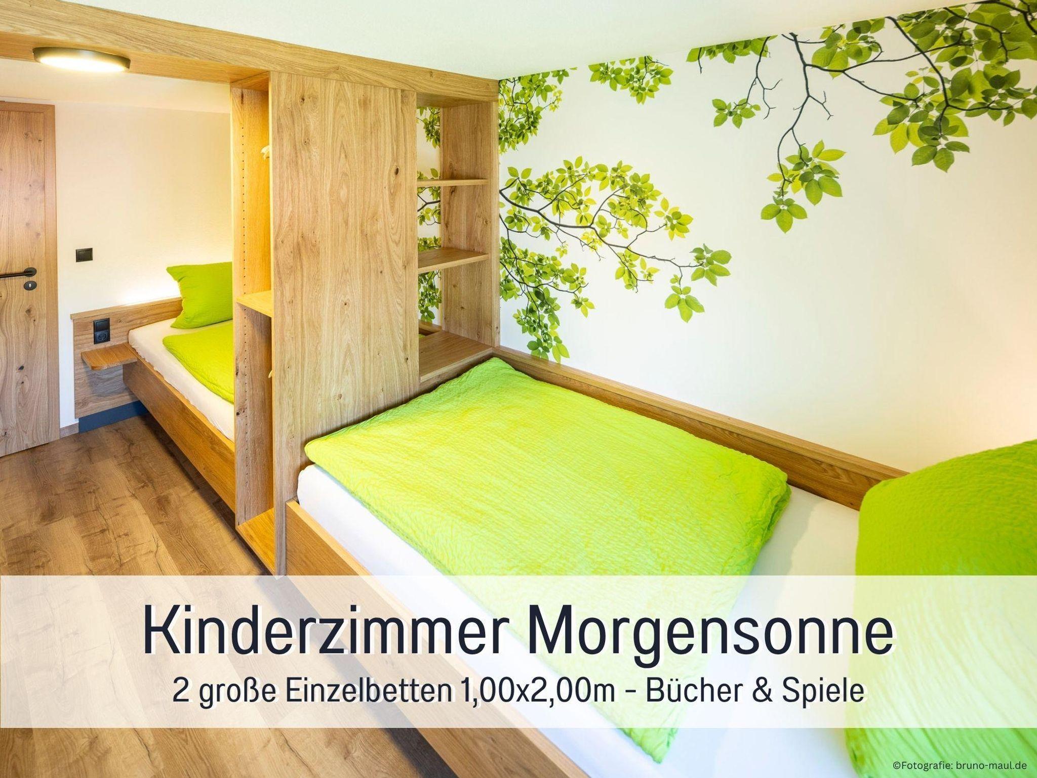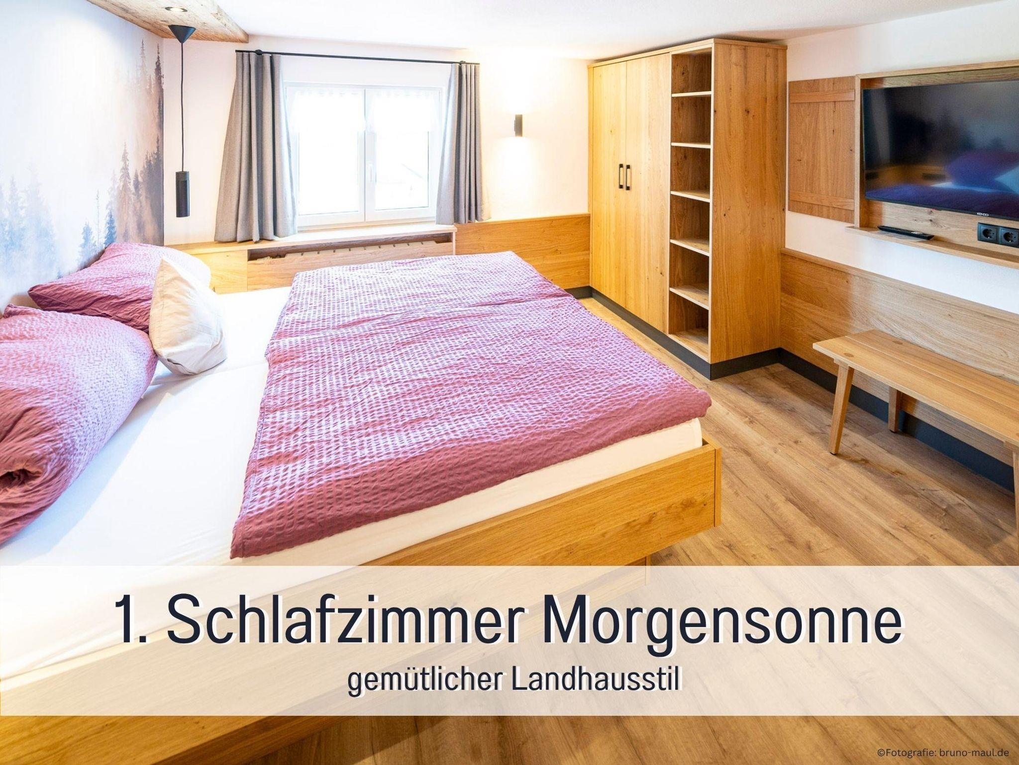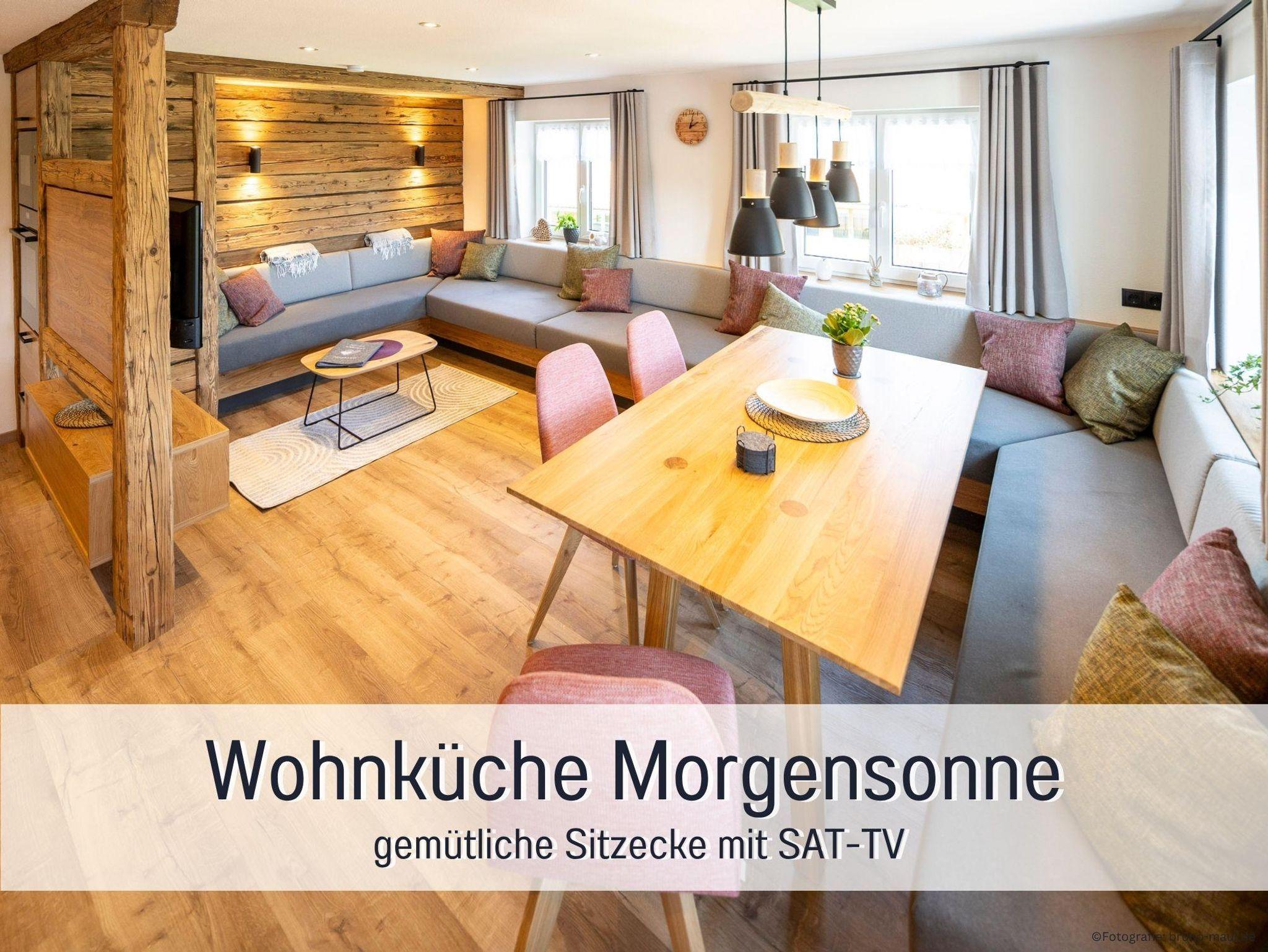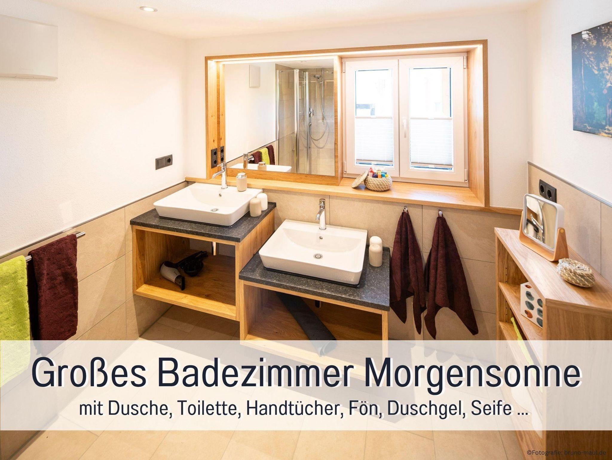 Unsere Ferienwohnung Morgensonne liegt im 1. Obergeschoss und ist mit ihren 90?m² unser großzügigstes Zuhause auf Zeit – ideal für zwei bis sechs Personen, die Wert auf Platz, Komfort und Sonnenlicht legen. Die Wohnung verfügt über drei separate Schlafzimmer und zwei Badezimmer mit Dusche und WC, sodass auch bei mehreren Mitreisenden jeder seine Rückzugsmöglichkeiten hat.