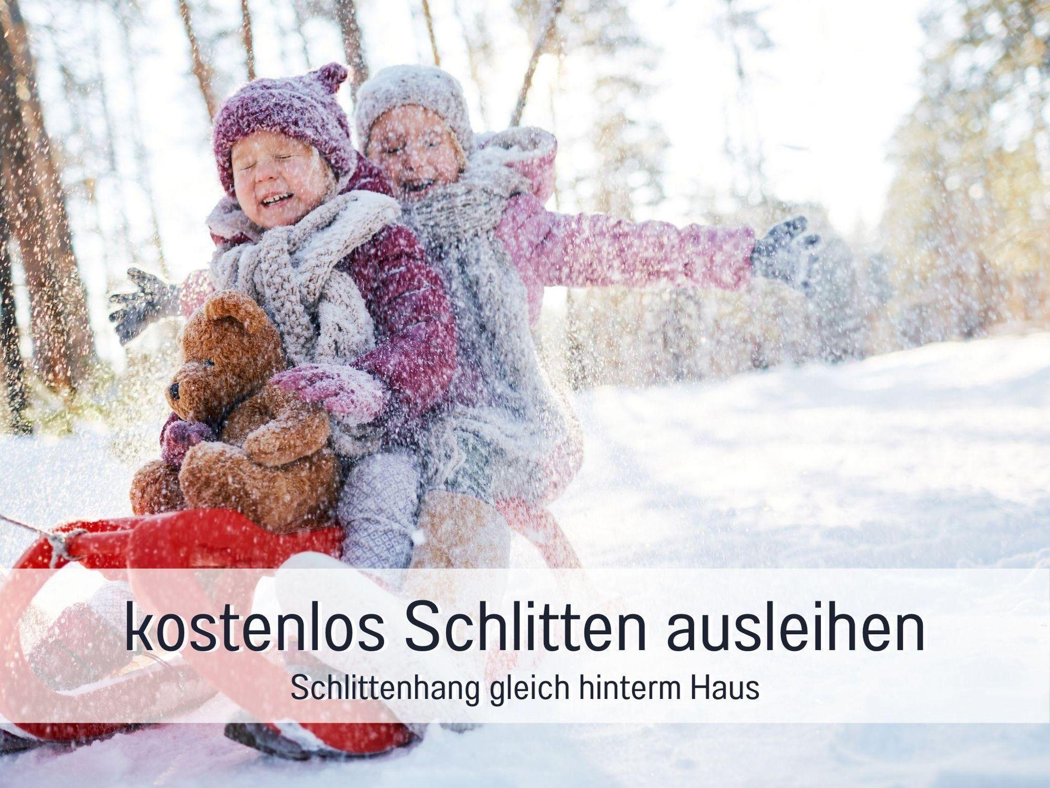 Im Winter starten Loipe und Rodelhang direkt am Haus, Schlitten stellen wir kostenlos zur Verfügung. Und auch E-Autos können bequem am Hof geladen werden.