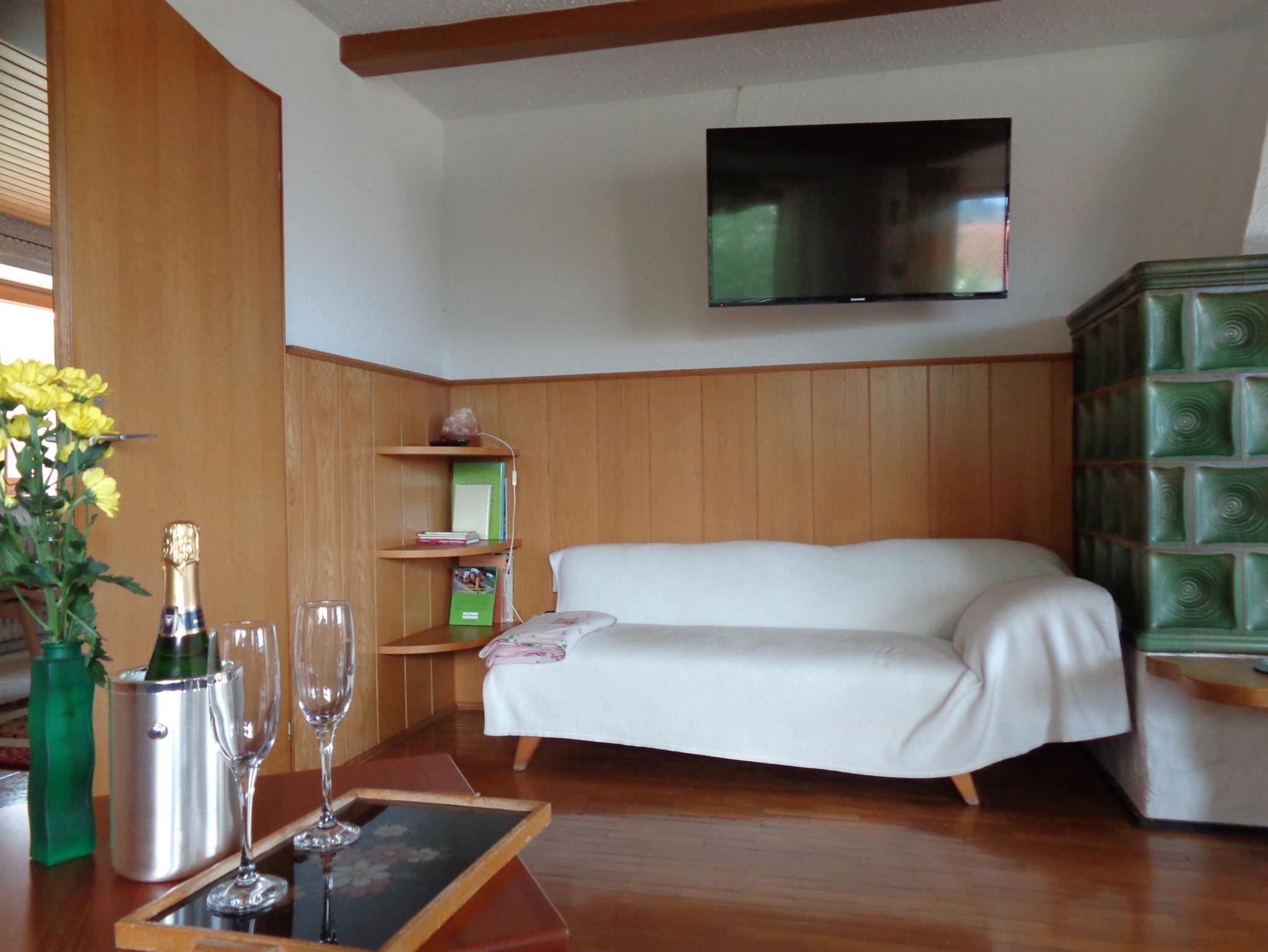 Die Wohnung verfügt über zwei Schlafzimmer, eines mit einem Doppelbett und im zweiten Zimmer stehen zwei Einzelbetten, beide Schlafzimmerfenster sind mit Mückengittern ausgestattet. Das große geräumige Wohnzimmer hat einen großzügigen Essplatz und einen gemütlich eingerichteten Fernsehbereich. Ein Kachelofen, welcher im Winter nach Rücksprache beheizt werden kann, gibt dem Raum ein gemütliches Ambiente. Brennholz ist jedoch im Preis nicht enthalten.
