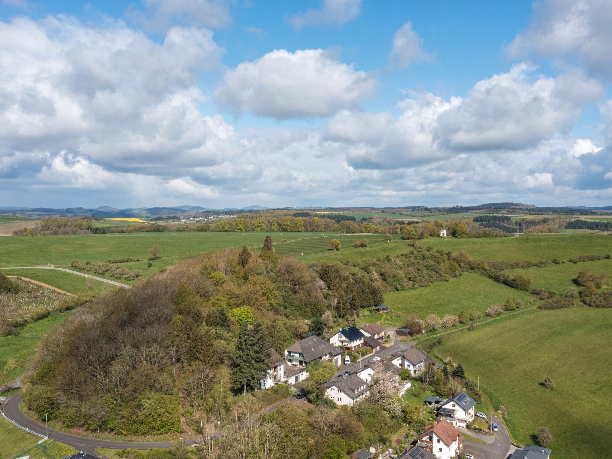 3-family house "Eifelnatur (Haus 1)", surrounded by trees and fields. On the outskirts, 300 m from the centre, in a quiet, elevated position on a slope, 10 m from the edge of the forest, 8 km from the lake, in a cul-de-sac, in the countryside. For shared use: property 1'000 m2, well-kept garden 450 m2 with lawn 300 m2, flowers, pond. Table tennis, children's playground (slide, swing, sandbox). In the house: sauna (extra). Billiard table, table football, storage room for bicycles, central heating system, washing machine (for shared use, extra). Linen change weekly. Towel change weekly. Bread roll service and beverage service possible on request (extra). Stepped path (25 steps) to the house. Grocery 5.3 km, supermarket 5.3 km, shopping centre 5 km, restaurant 150 m, bar 3.3 km, bakery 5.3 km, café 3.3 km, bicycle rental 10 km, bus stop "Daun" 10 km, railway station "Gerolstein" 23 km, outdoor swimming pool 7.6 km, indoor swimming pool 10 km, bathing lake 7.6 km. Golf course (18 hole) 15 km, tennis 3.5 km, minigolf 7.8 km, riding stable 10 km, walking paths from the house 50 m. Nearby attractions: Vulkanmaare, Vulkanmuseum, Kreuzweg, Strohner Märchen, Wildpark Daun, Adler- und Wolfspark Kasselburg. Well-known lakes can easily be reached: Pulvermaar 1.5 km. Please note: car recommended. The owner does not accept any youth groups. Loading and unloading of baggage is possible at the holiday house. Neighbourhood highly sensitive to noise. Quietness and good behaviour expected. Self-service bar with drinks and food in the house (extra). It is also accessible to guests from the other two houses. The leisure room / sauna is located in the neighboring house and is for all guests.
