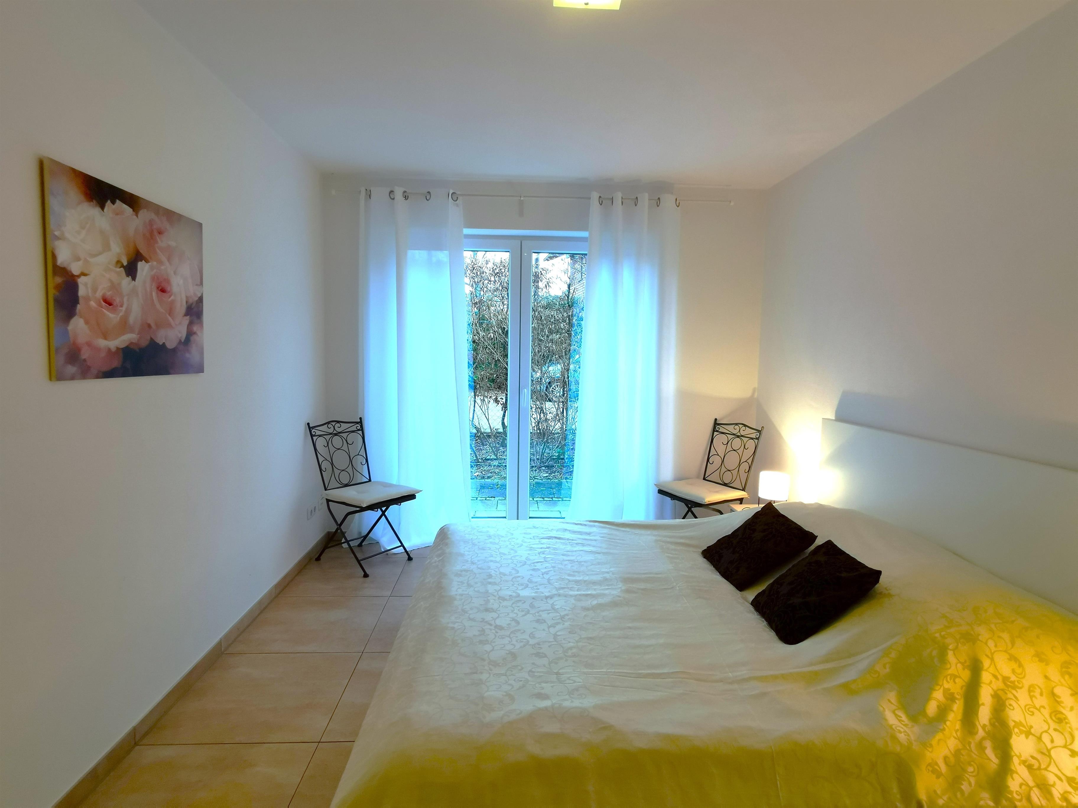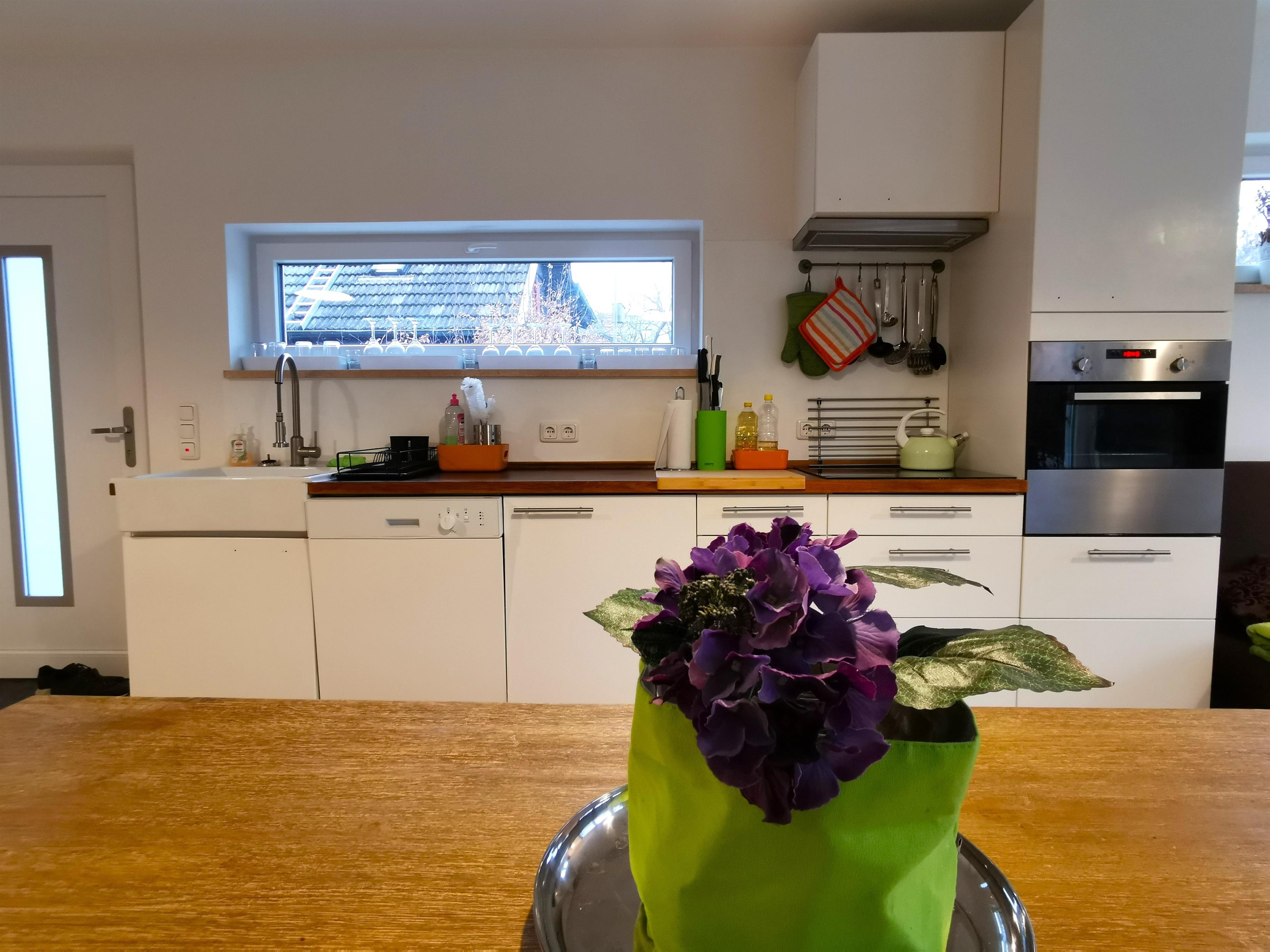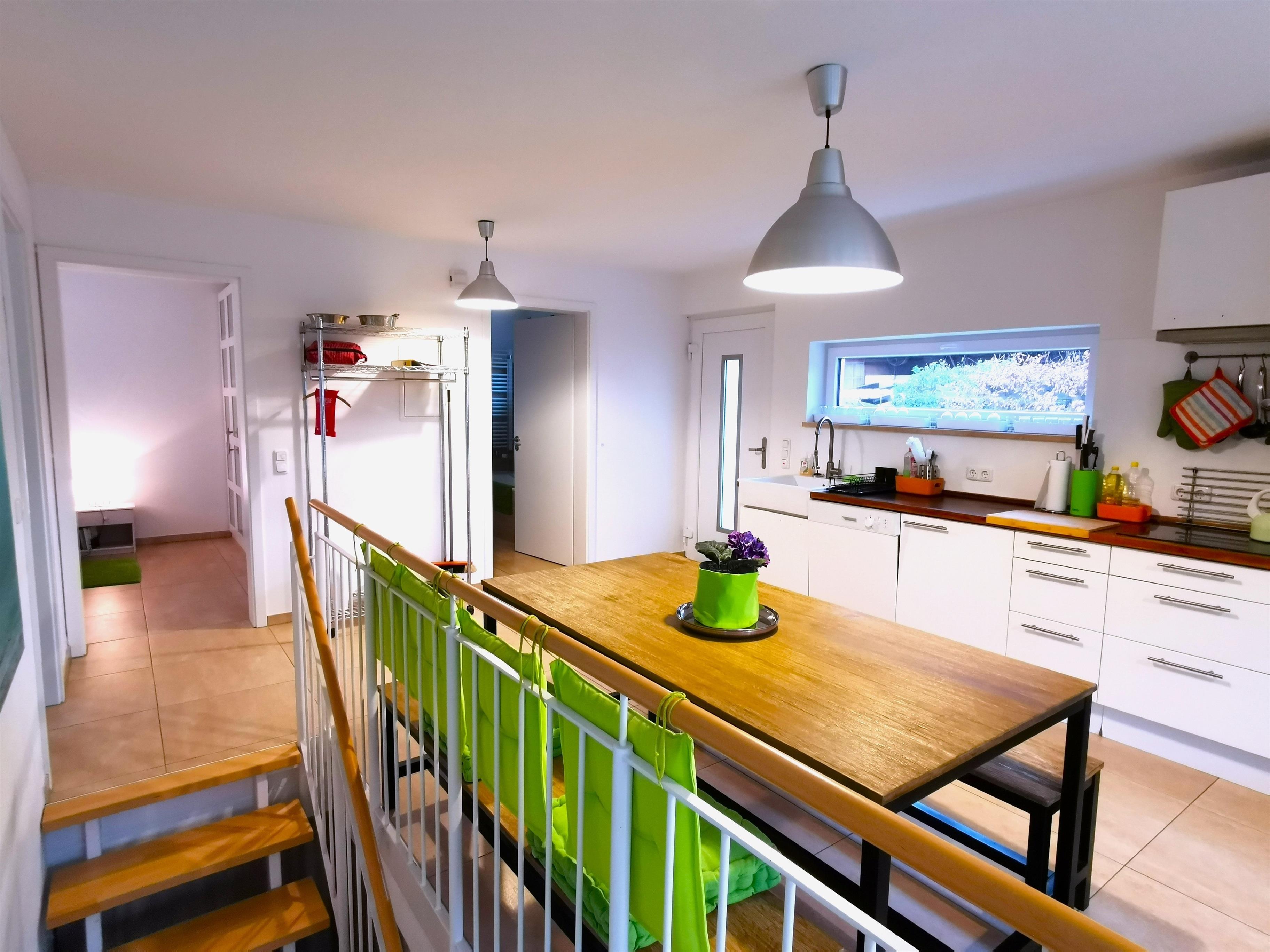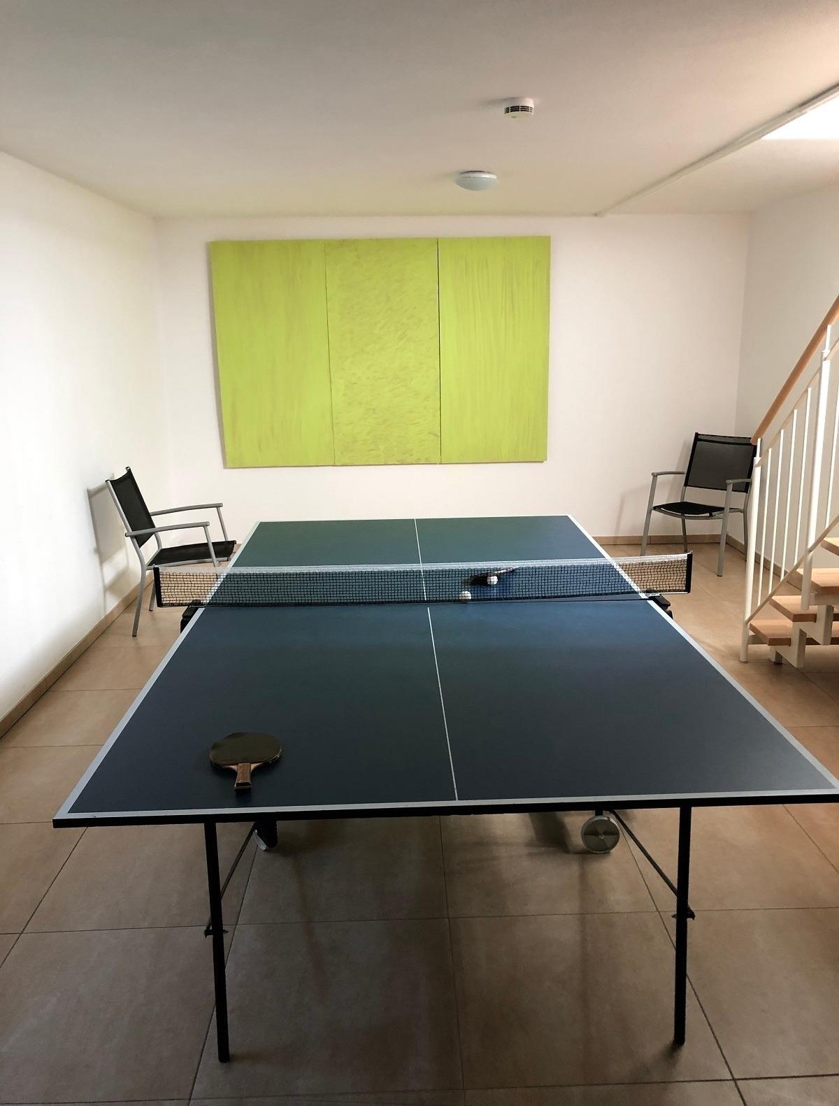 Seenahe Gartenwohnung mit großer Indoor Tischtennisplatte inmitten eines Naturparadieses mit Obstbäumen und Wildrosen .