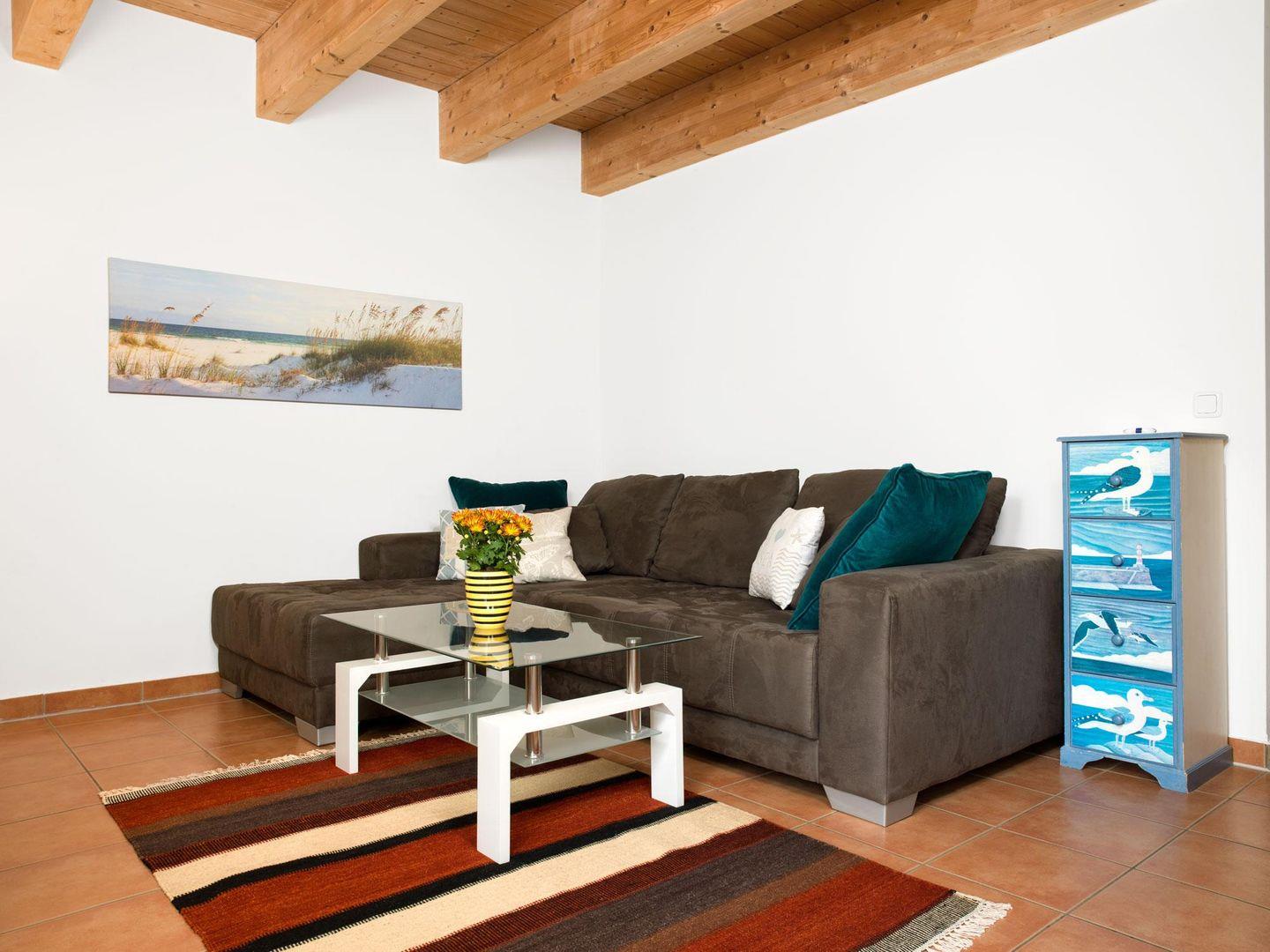 In dieser Ferienwohnung erwartet Sie ein Wohnbereich mit TV/Hifi/CD/DVD und einer offen gestalteten Küchenzeile, die mit Herd, Kühlschrank, Spülmaschine, Kaffeemaschine und Toaster ausgestattet ist.