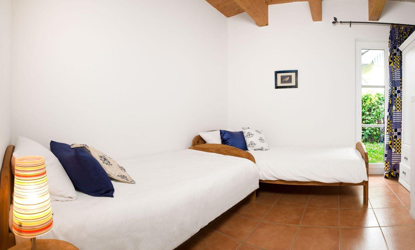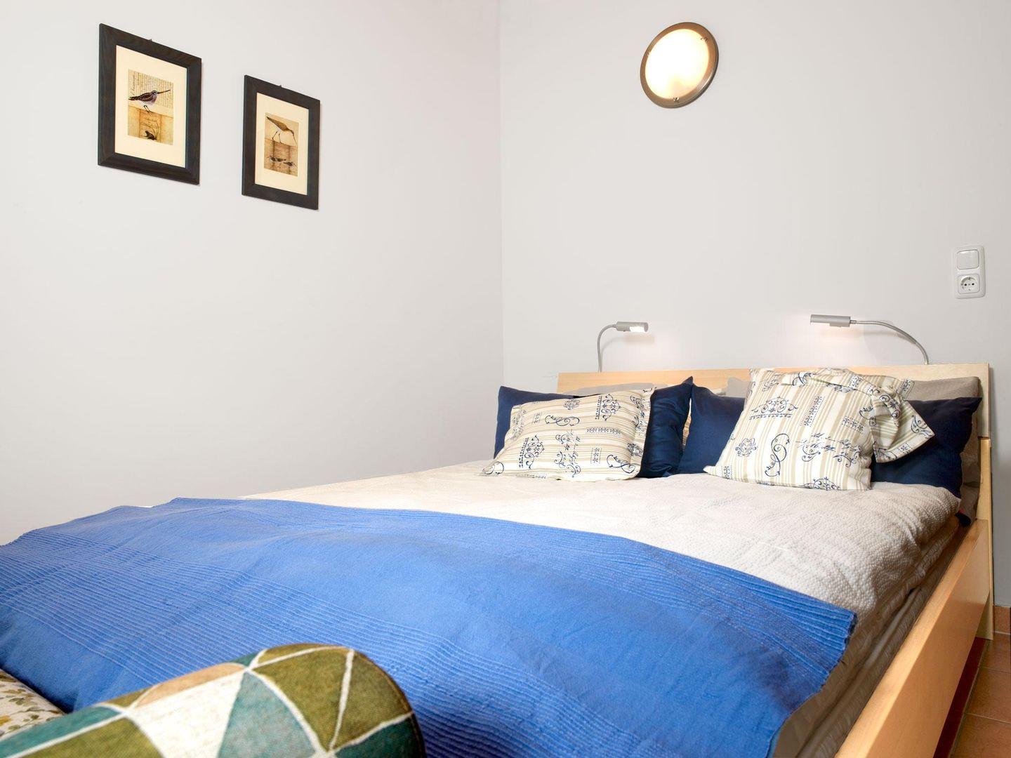 Ein Schlafzimmer verfügt über ein Doppelbett (140x2,00), das zweite Schlafzimmer verfügt über 2 Einzelbetten. Das Bad ist mit Dusche und WC ausgestattet.
