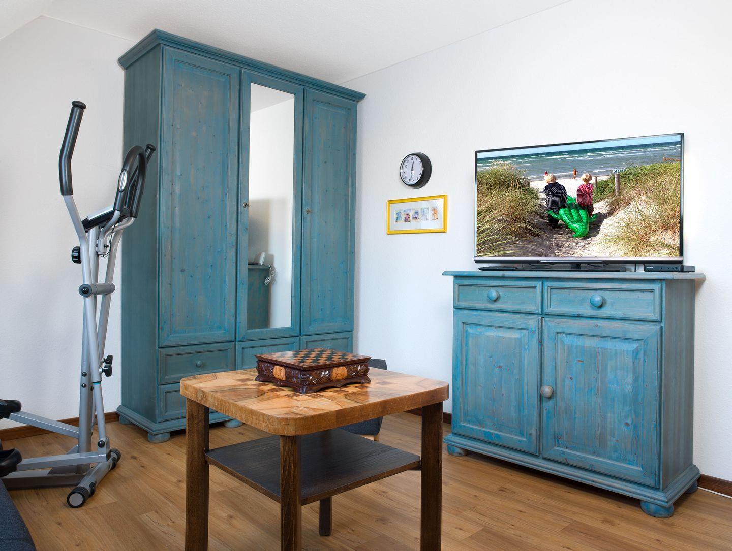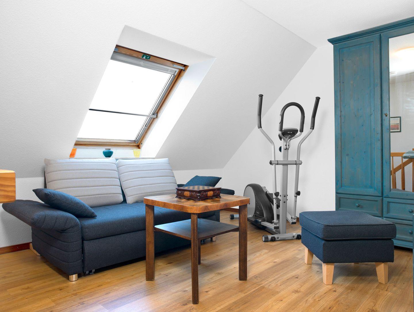 Ein kleines Schlafzimmer mit Etagenbett. Über eine Treppe erreichen Sie ein weiteres Schlafzimmer mit Doppelbett im Dachgeschoss. In der offenen Galerie steht eine Schlafcouch, mit Velux-Verdunklungsrollo am Fenster sowie ein Hometrainer.