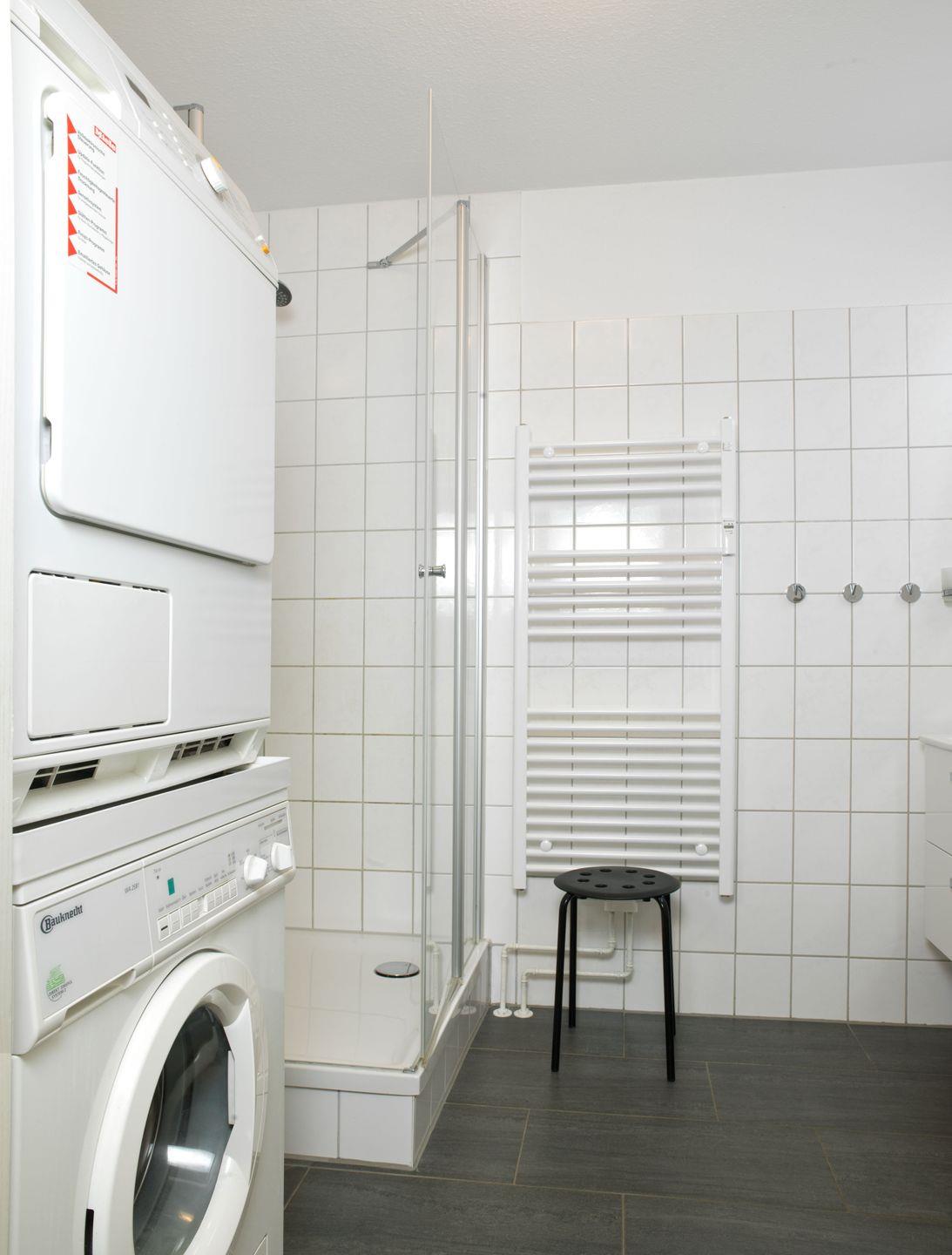 Das Bad ist mit Dusche/WC und Waschmaschine und Trockner ausgestattet.