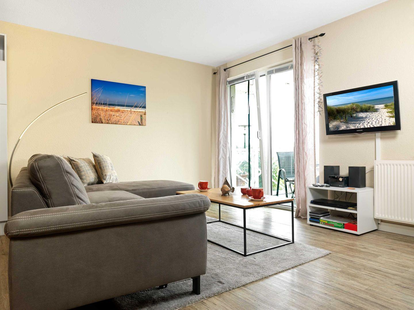 Vom gemütlich ausgestatteten Wohnzimmer gelangen Sie auf den schönen Süd-Balkon. Von hier können Sie direkt auf den Hafen von Kirchdorf schauen und die Ostseeluft genießen.