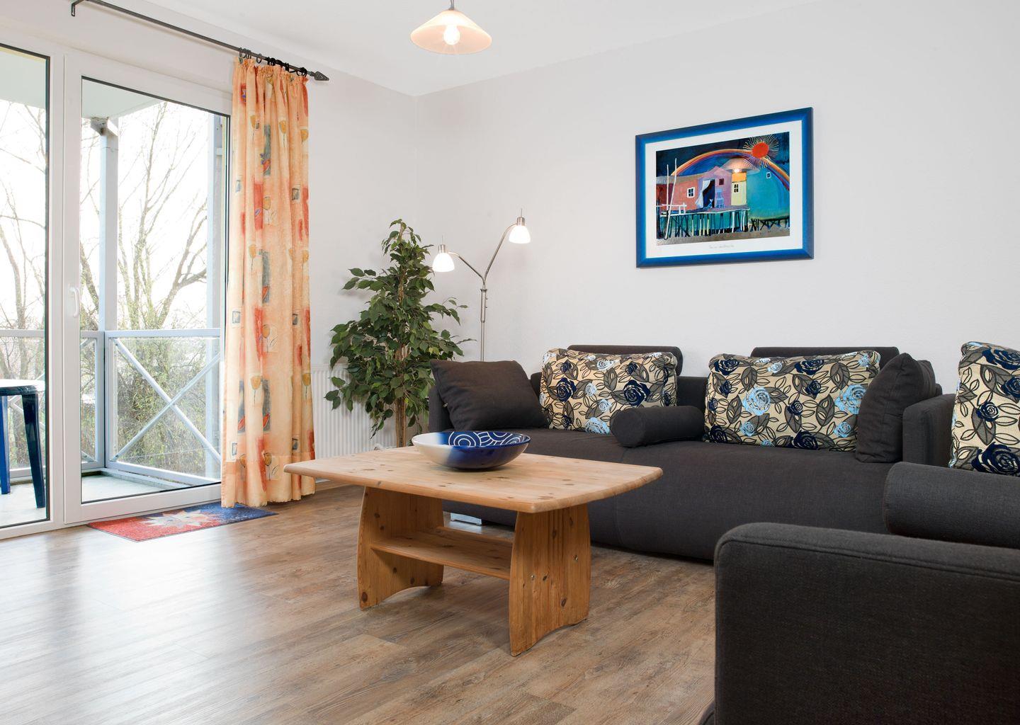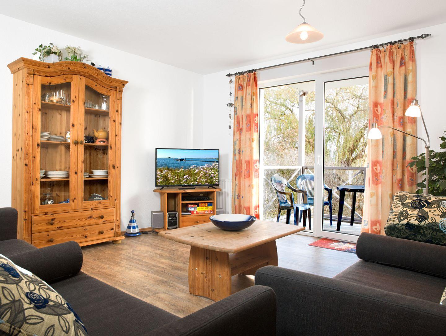 Das gemütliche Wohnzimmer mit einer gemütlichen Couch, Fernseher verspricht entspannten Urlaub. Vom schönen Balkon mit Balkonmöbeln haben Sie einen herrlichen seitlichen Blick auf den Hafen von Kirchdorf.