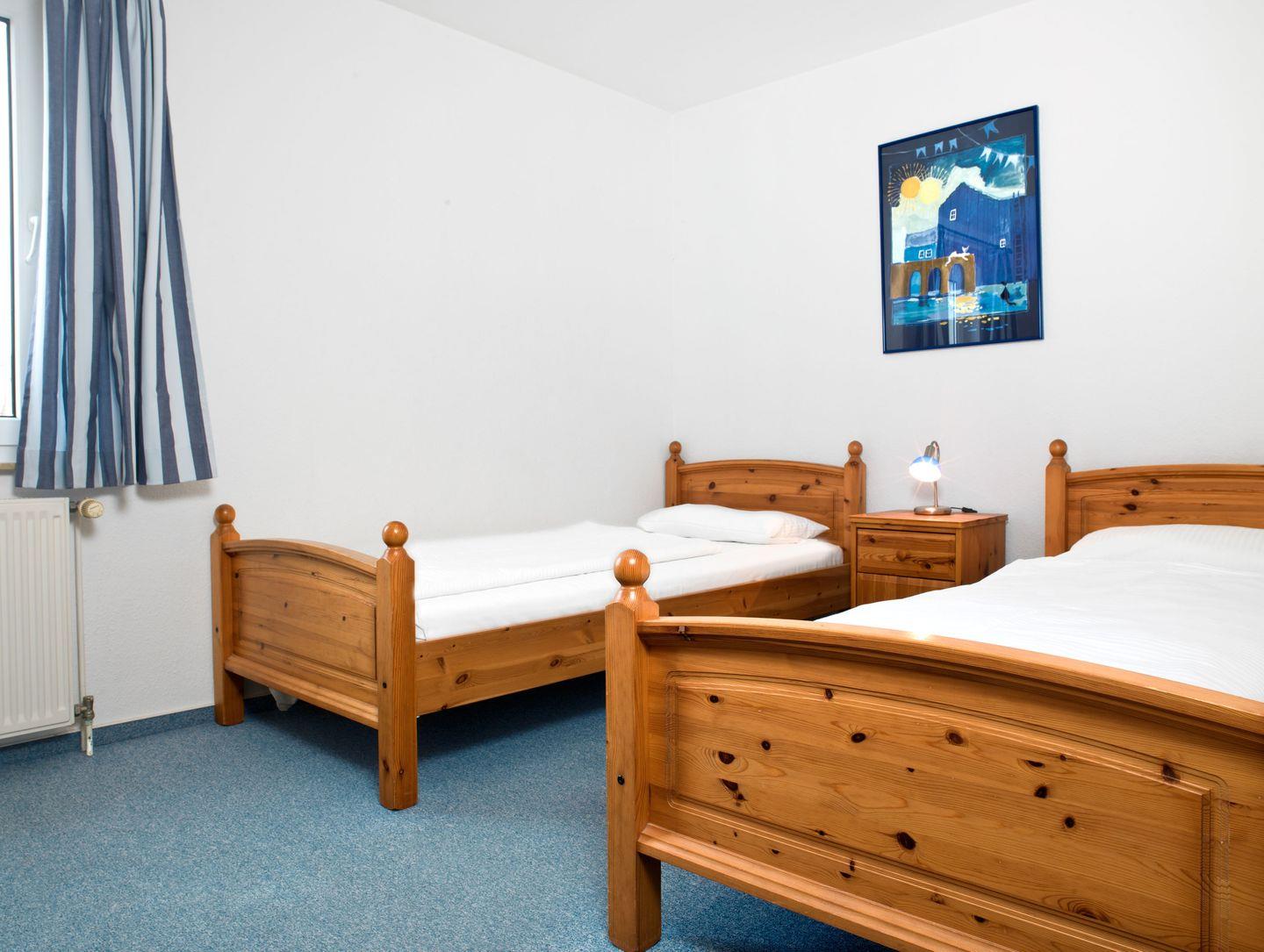 Schlafzimmer mit einem Doppelbett und großem Schrank. Kleines Schlafzimmer mit 2 Einzelbetten.