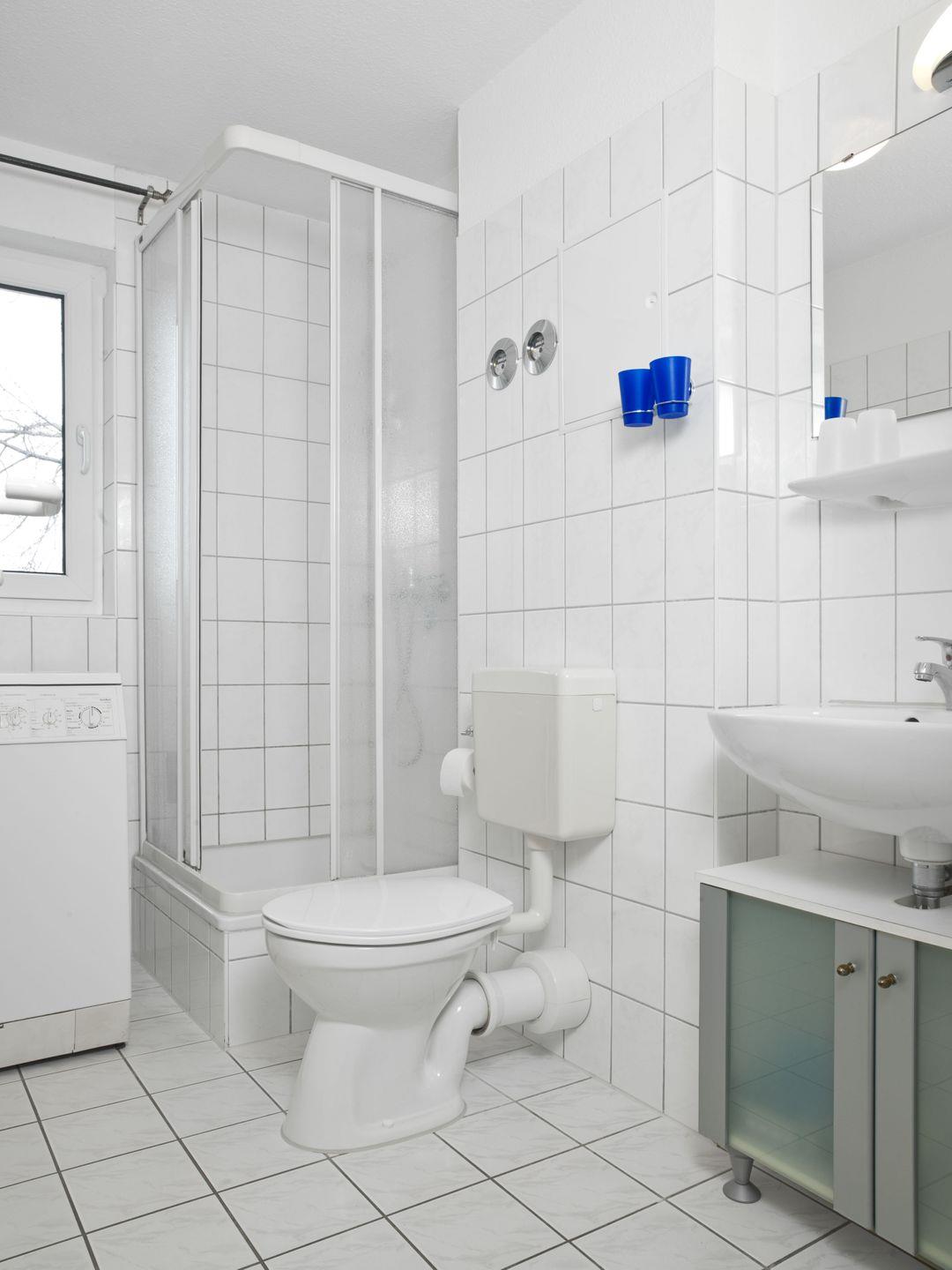 Bad mit WC, Dusche und Waschbecken.
