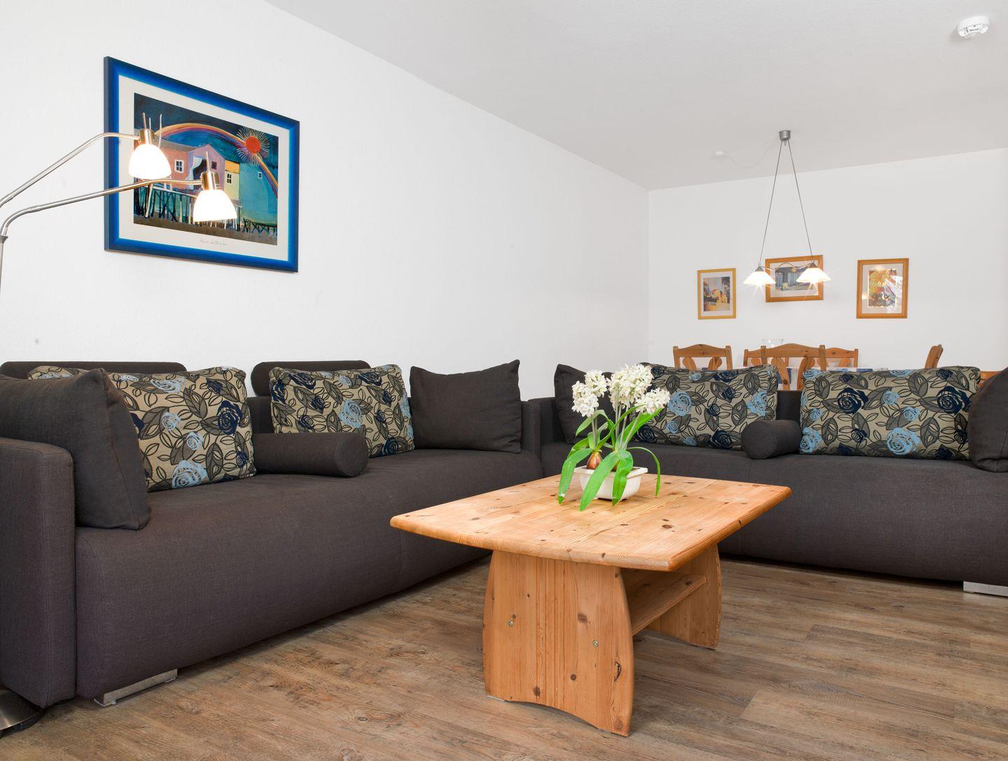 Das freundliche Wohnzimmer mit einer Küchenzeile lädt ein zum gemütlichen Verweilen. Die Küche verfügt über einen Ceran-Herd, Backofen, Kaffeemaschine etc.