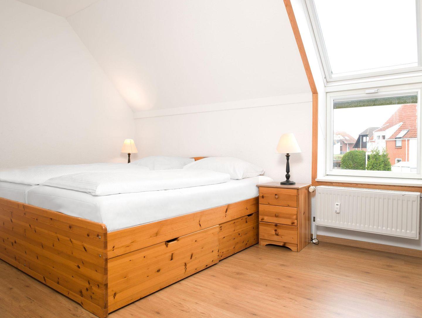Das Schlafzimmer verfügt über ein Doppelbett (180x200). Das Bad ist mit Dusche/WC ausgestattet.