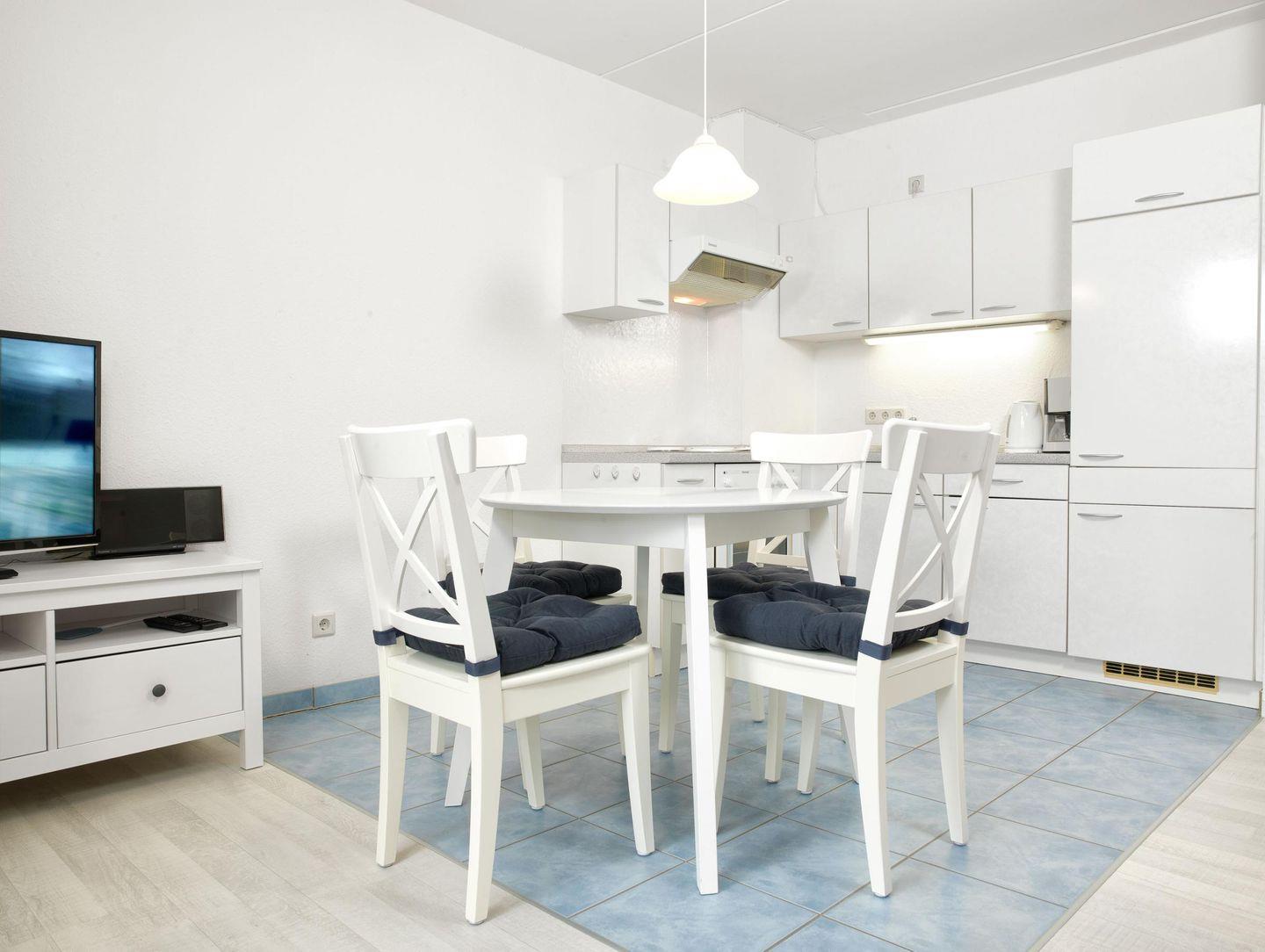 Im Wohnzimmer befindet sich eine Schlafcouch für 2 Personen und eine Essecke.