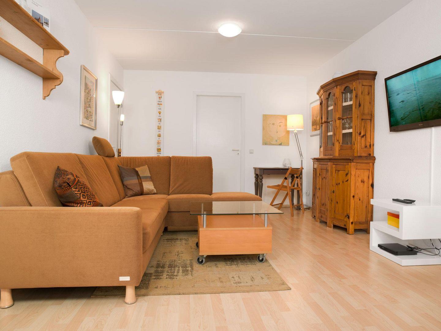 Im gemütlichen Wohnzimmer mit Couch und Essecke stehen für Sie ein Flach-TV und eine Stereoanlage bereit.