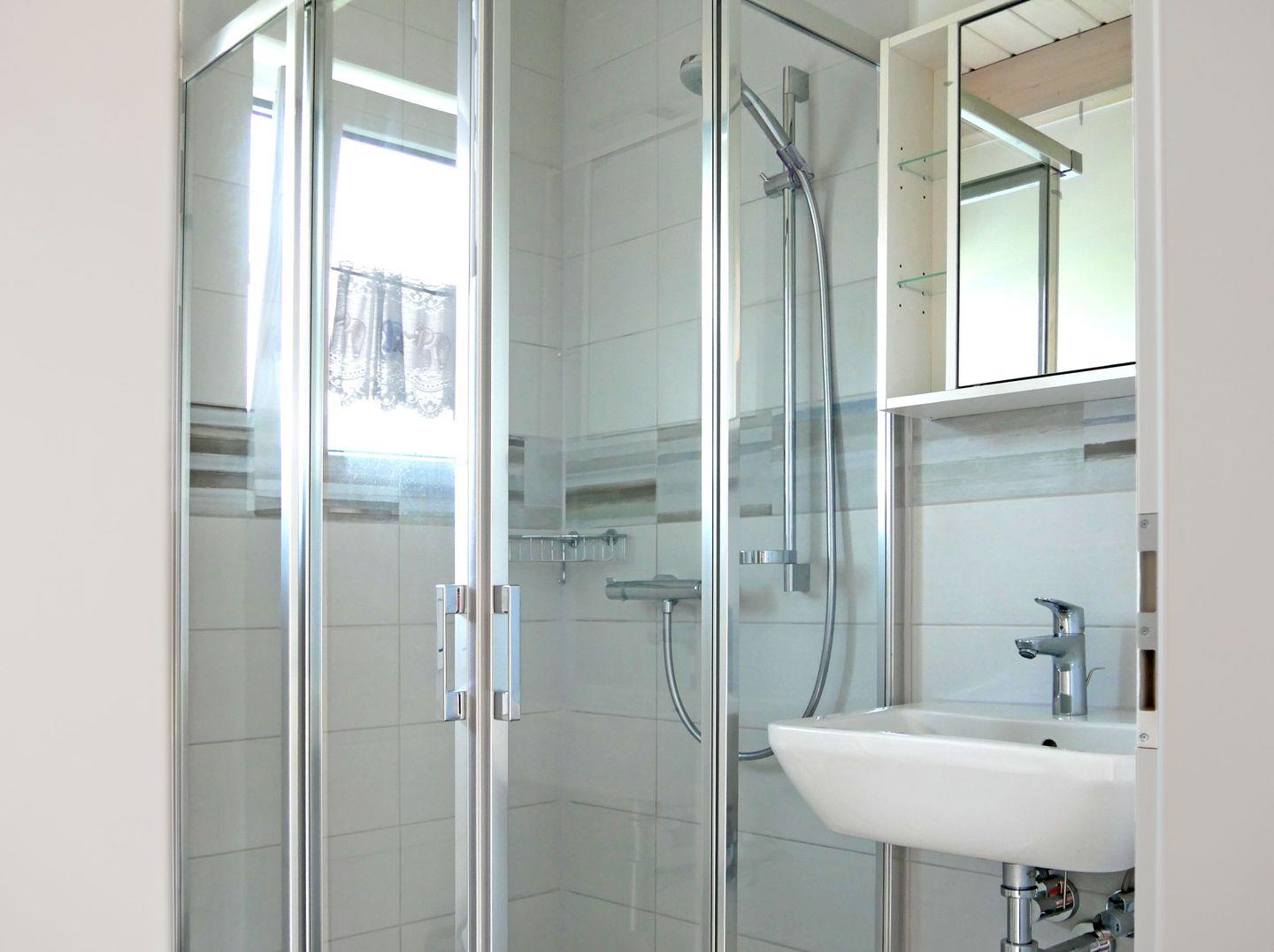 Im OG befindet sich ein Schlafzimmer mit Doppelbett, ein Schlafzimmer mit zwei Einzelbetten, ein Bad mit Dusche und WC sowie eine gemütliche Sitzecke mit TV.