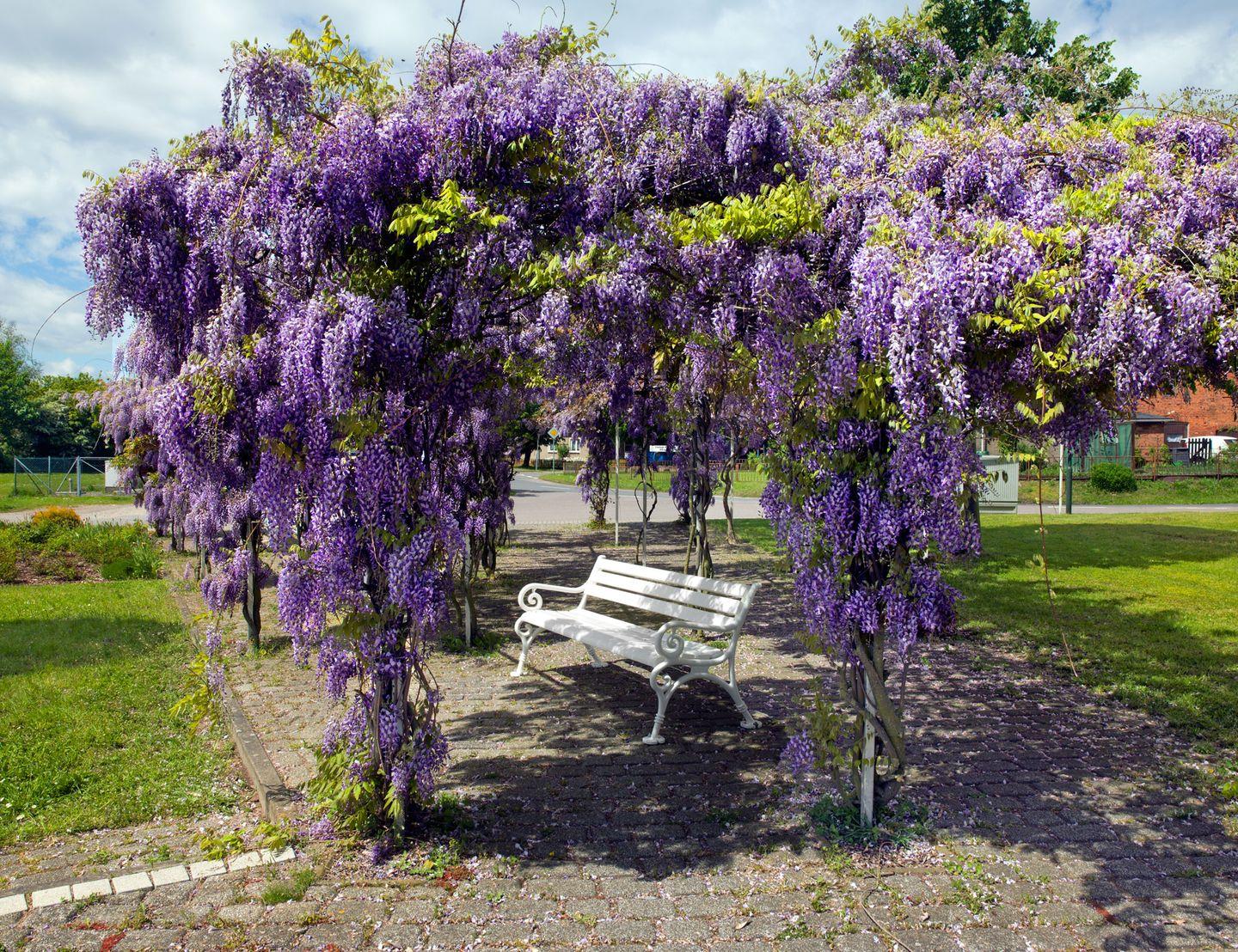 Von dort aus gelangen Sie auf die mit Gartenmöbeln ausgestattete, überdachte Terrasse.