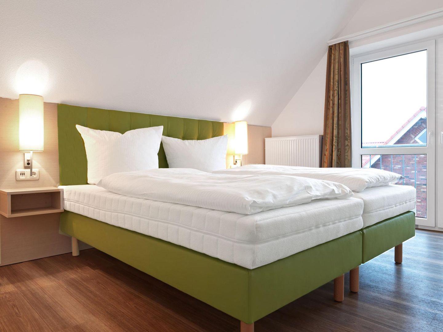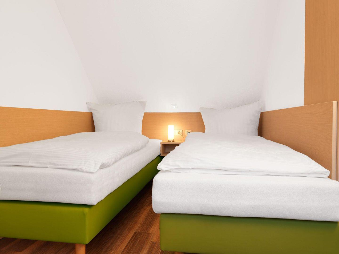 Zwei geräumige Schlafzimmer im Dachgeschoß, eins mit Doppelbett und eins mit zwei Einzelbetten, sowie ein Bad mit Dusche lassen bis zu 6 Personen einen entspannten Urlaub verleben.