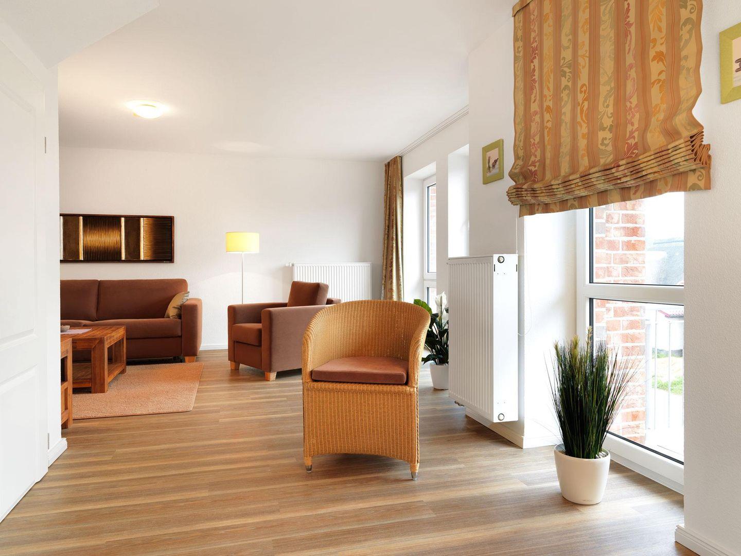 Ein schönes Wohnzimmer mit offener, optisch vom WZ getrennter Küche mit Eßbereich, Schlafcouch sowie einem Balkon, der seitlich zum Hafen ausgerichtet ist und ein Gäste WC erwarten Sie auf der ersten Ebene!