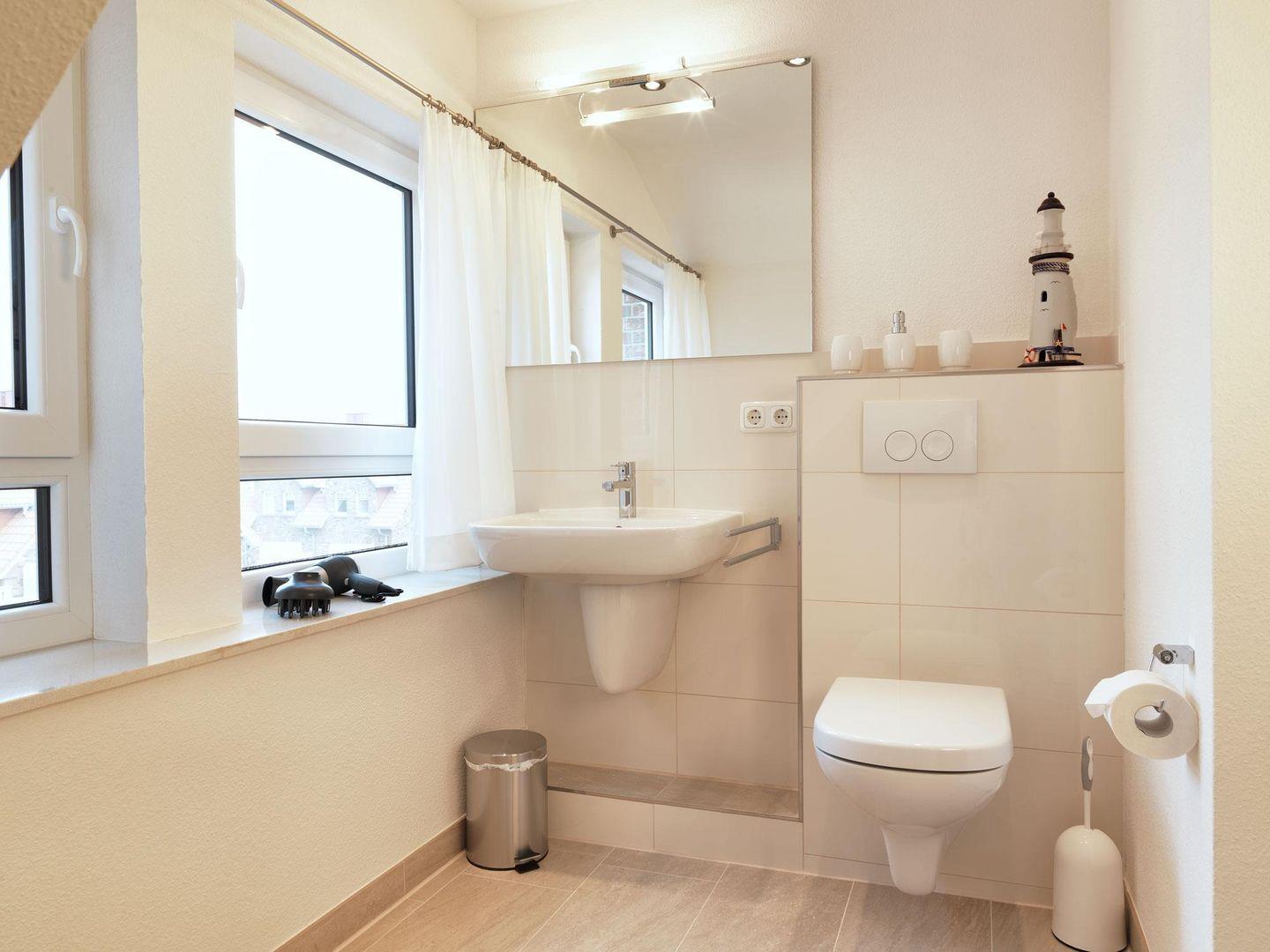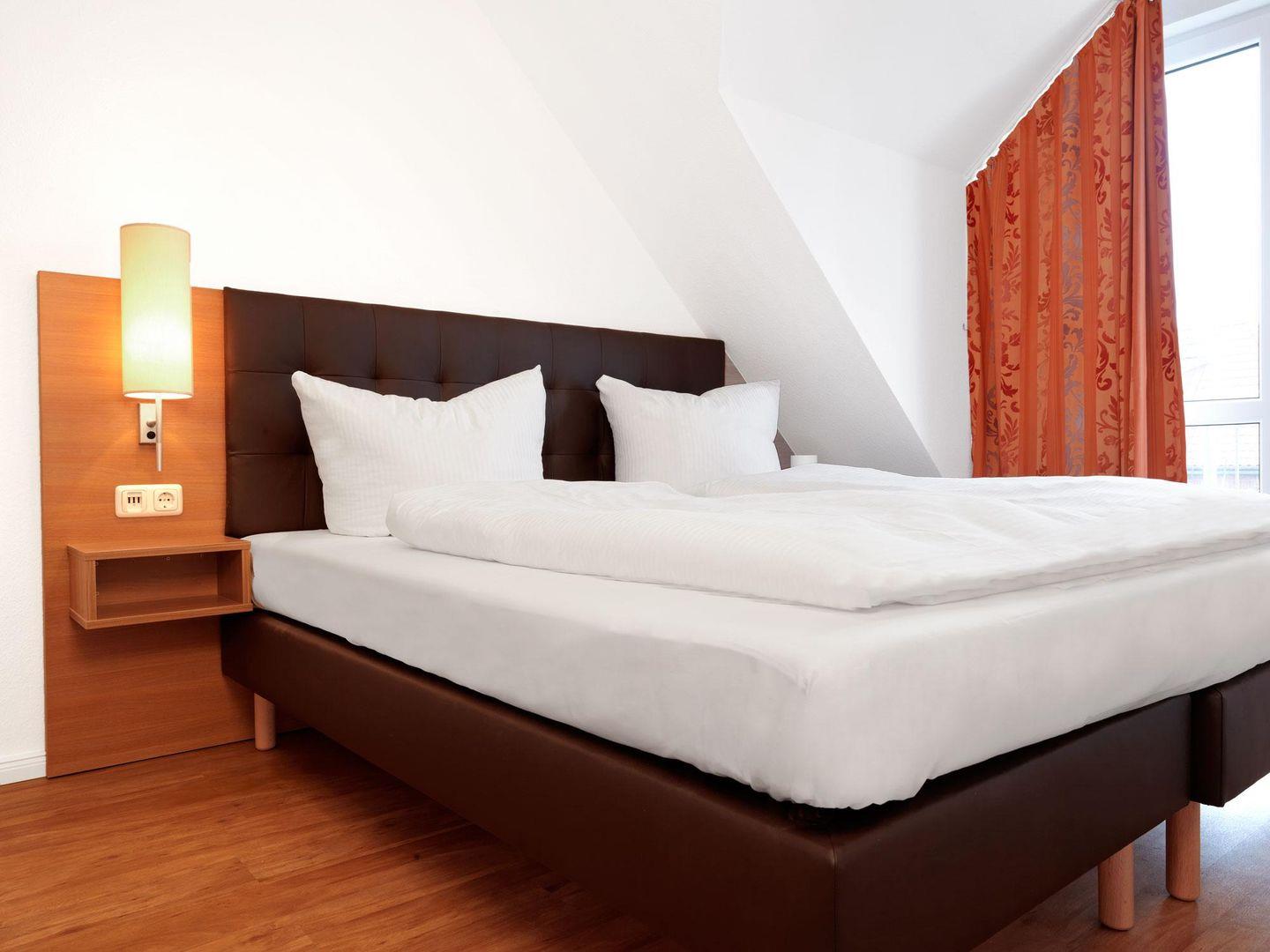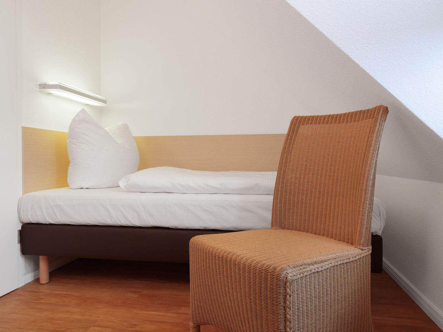 Zwei Schlafzimmer im Dachgeschoß, eins mit Doppelbett, eins mit zwei Einzelbetten unter schrägen Wänden sowie ein Bad mit Dusche lassen bis zu 4 Personen einen entspannten Urlaub verleben.