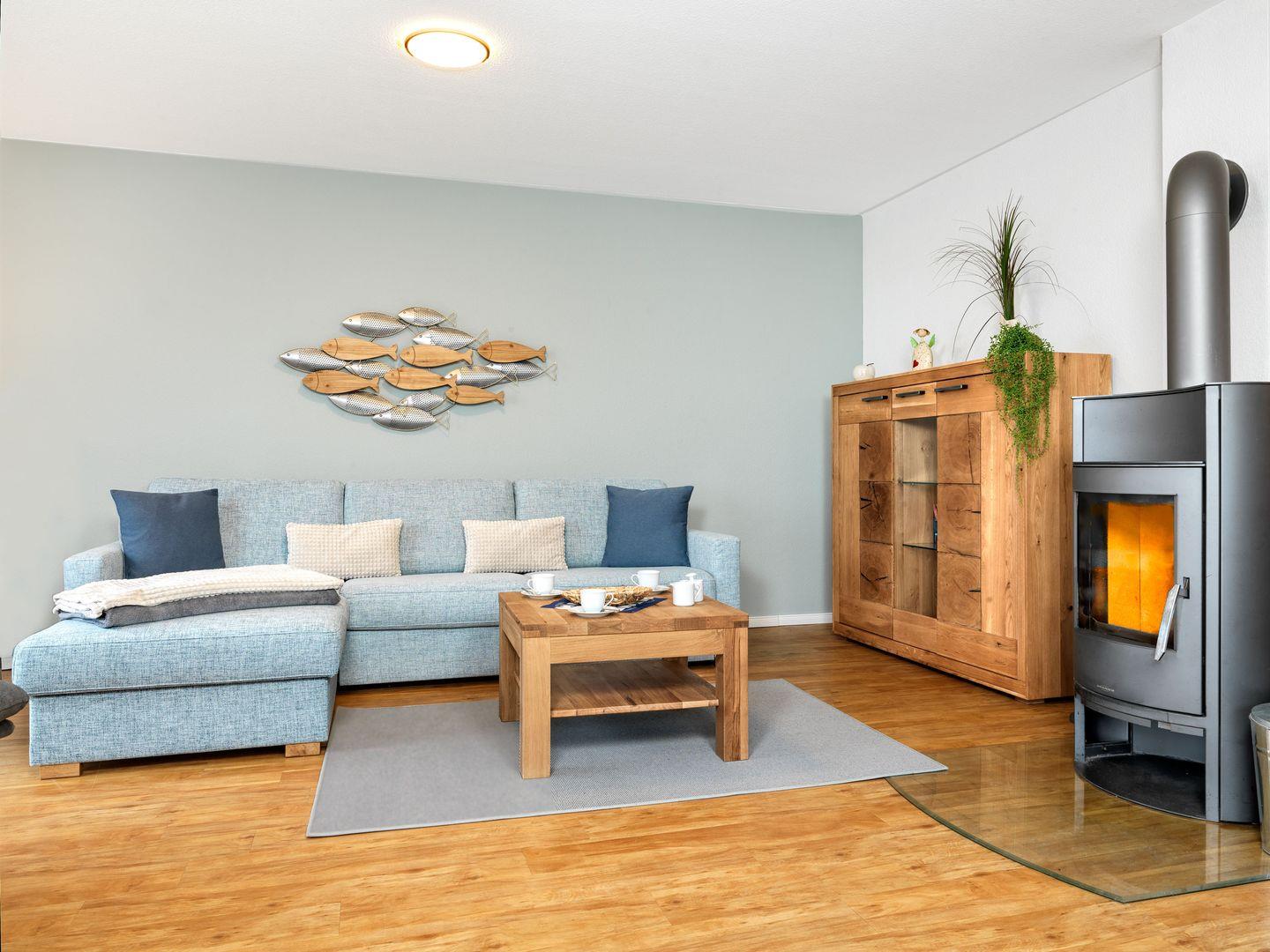 Ein großes Wohnzimmer mit offener Küche, Kaminofen, Schlafcouch sowie einem Balkon, der zum Hafen ausgerichtet ist erwarten Sie!