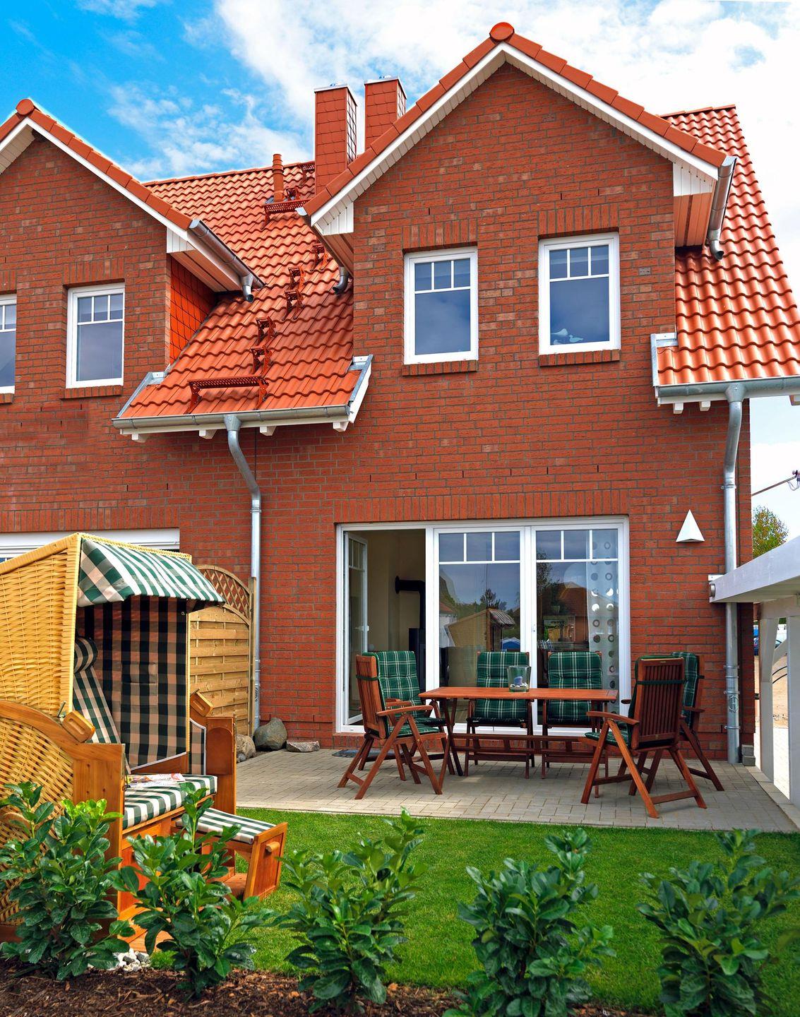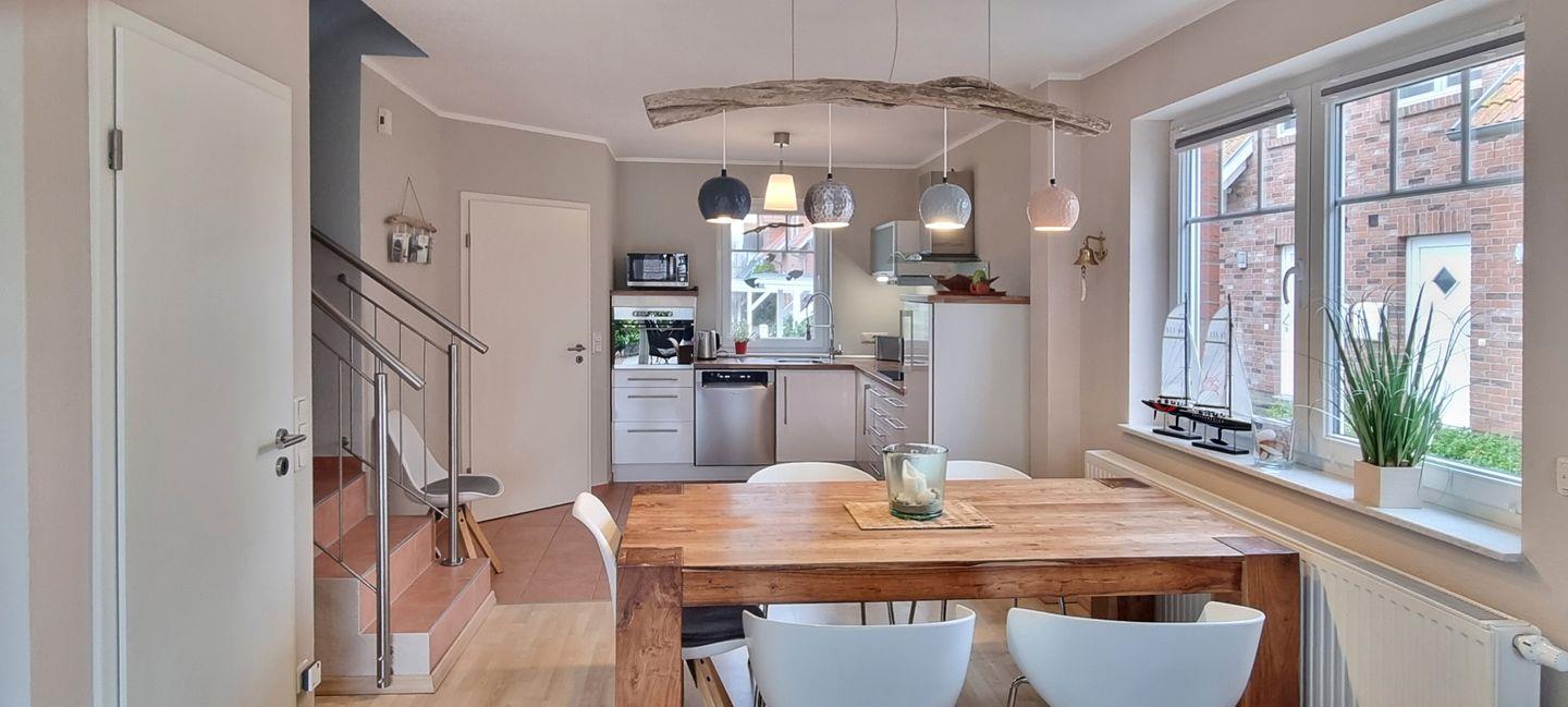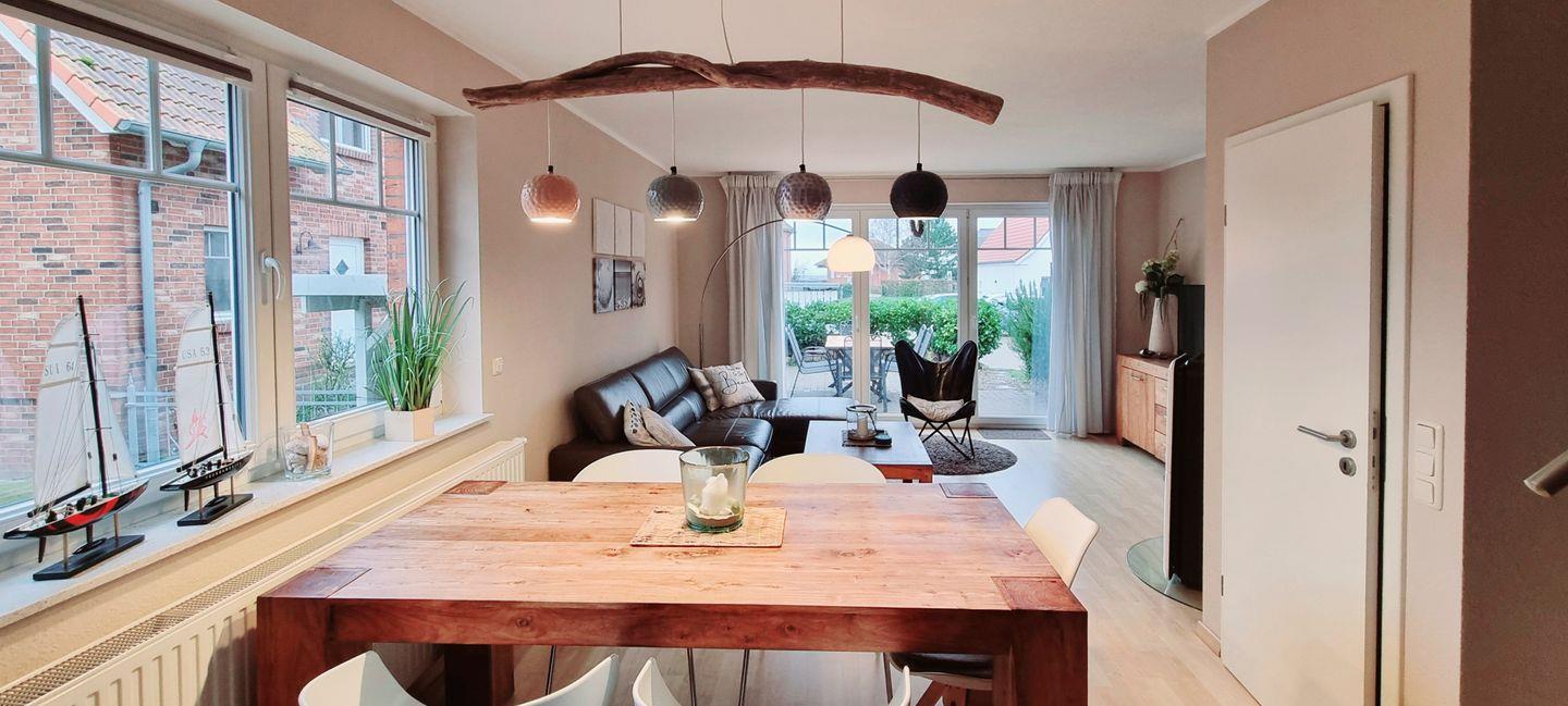 Die Doppelferienhaushälfte mit ca. 80m² verfügt im Erdgeschoss über einen großzügigen Wohnraum mit separater Essecke und moderner, heller Einbauküche. Vom hochwertig eingerichteten Wohnzimmer aus haben Sie direkten Zugang zur Süd-West-Terrasse mit Teak-Holz-Möbeln und einem kleinen Garten.