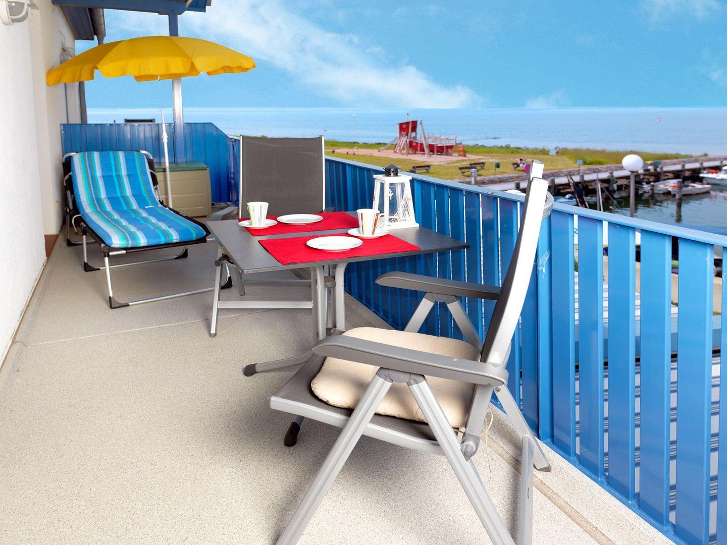 Genießen Sie den freien Blick auf den Hafen von Timmendorf, traumhafte Sonnenuntergänge und das Meer vom schönen Balkon oder von der Couch.