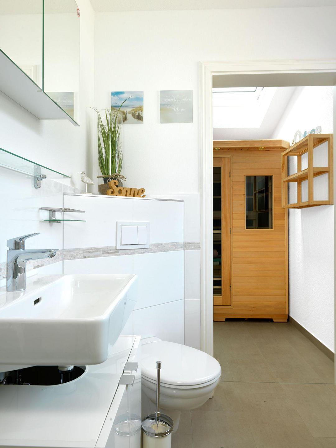 Im Erdgeschoss erwartet Sie das großzügige Wohnzimmer mit offener, sehr gut ausgestatteter Küche sowie ein Schlafzimmer mit Doppelbett. Das Wohnzimmer, mit dem freien Blick ins Grüne, bietet Ihnen viel Unterhaltung mit Flach-Maxi-TV, DVD,CD sowie MP3 Player. An kalten Tagen sorgt der Kaminofen für heimelige Wärme. Außerdem befindet sich ein Bad mit Dusche und WC im EG sowie ein Schlafzimmer mit Doppelbett. Bei jedem Wetter können Sie die Infrarot Kabine (3 Personen) oder im Garten die Fasssauna (4 Personen) und die Außendusche (nur bei frostfreien Temperaturen) genießen. Im Obergeschoß befinden sich 2 weitere Schlafzimmer, eins mit Doppelbett und eins mit 2 Einzelbetten. Ein weiteres Bad mit Dusche, Badewanne und WC erwartet Sie ebenfalls im OG. Die Badewanne steht direkt vor einem großen Fenster und bietet Ihnen einen großartigen Fernblick über die Felder bis zum Wasser.