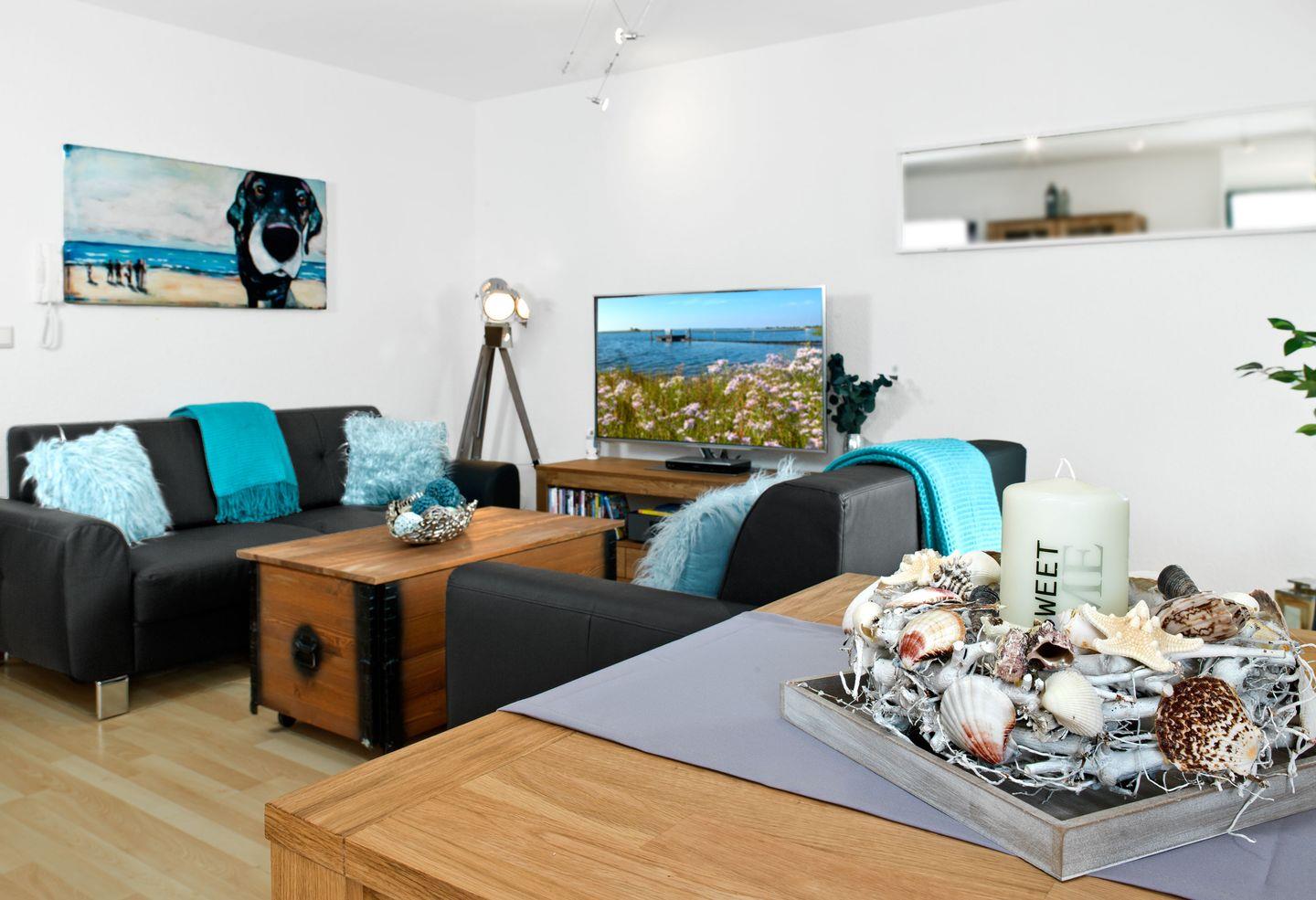 Im Wohnzimmer empfängt Sie nicht nur ein gemütlicher Sitzbereich, sondern auch ein 50 Zoll TV, Blue-Ray Player und eine Mini-Stereoanlage mit allem was heutzutage angesagt ist (Blue-Ray, DVD, CD, MP3, USB-Anschluss, Bluetooth). Ein Kinderreisebett, Kinderteller und Kinderbesteck stehen für unsere kleinen Gäste bereit. Der Kinder-Hochstuhl kann direkt bei PAS dazu gebucht werden.