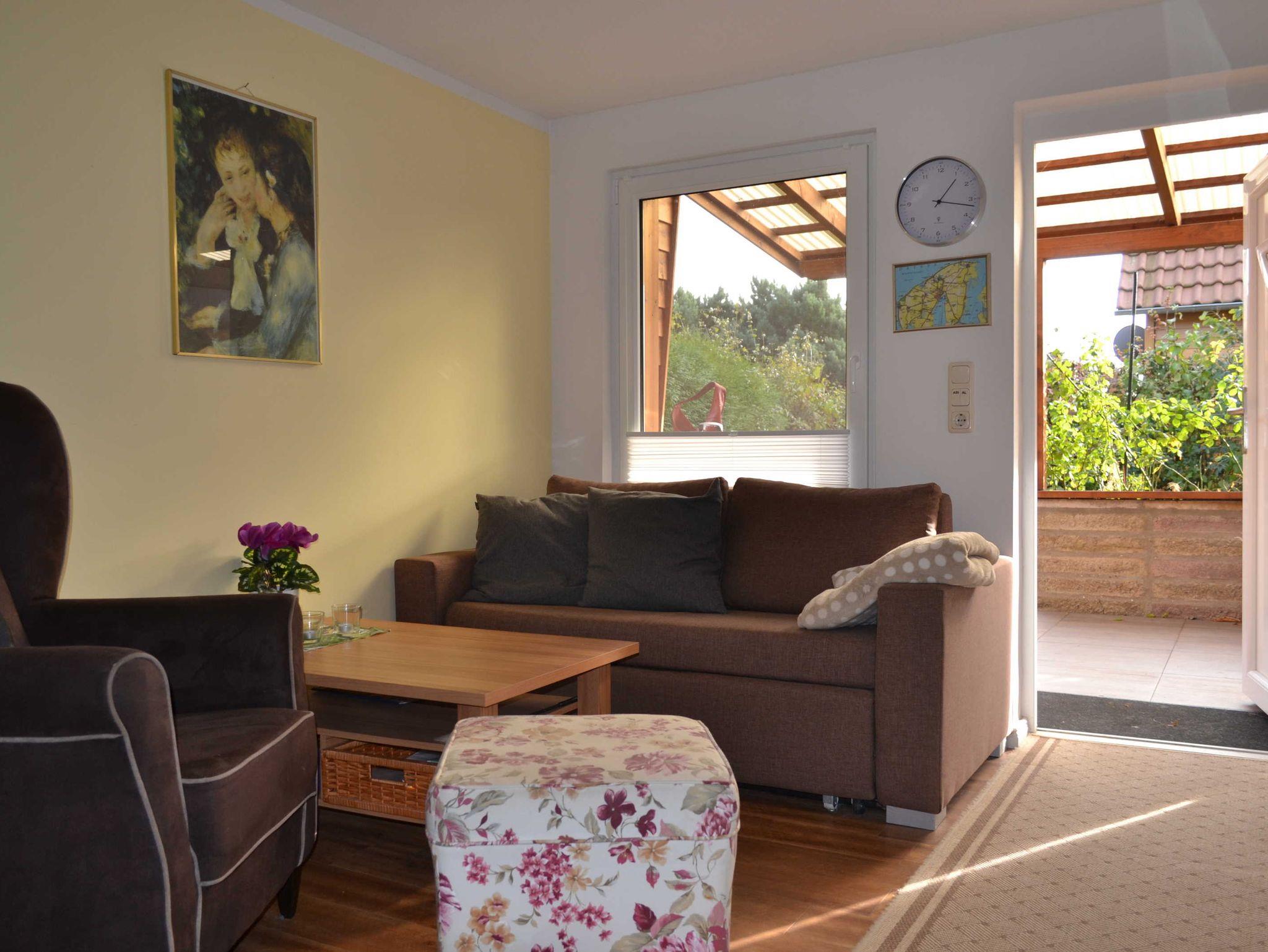 Das Häuschen verfügt über 1 Schlafzimmer mit Doppelbett und TV, 1 Wohnzimmer mit kleiner, ausziehbarer Couch für evtl. ein Kind, und ebenfalls Sat-TV, vollausgestatteter Küche, Bad mit Dusche und WC, Haarföhn, Terrassenmöbel mit Grill, 2 Gartenliegen.