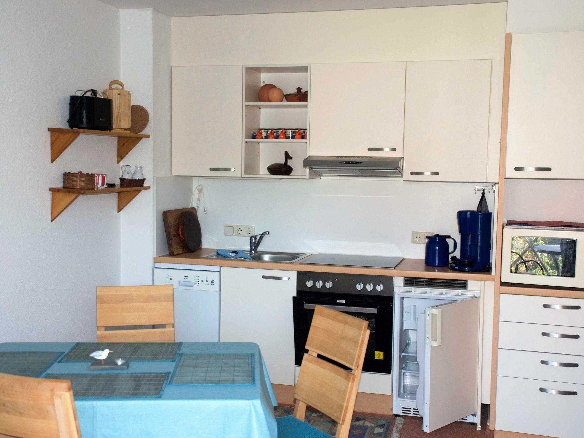 Die offene Küche enthält ein Herd mit Backofen, Kühlschrank mit Gefriermöglichkeit, eine Mikrowelle sowie eine Spühlmaschine.