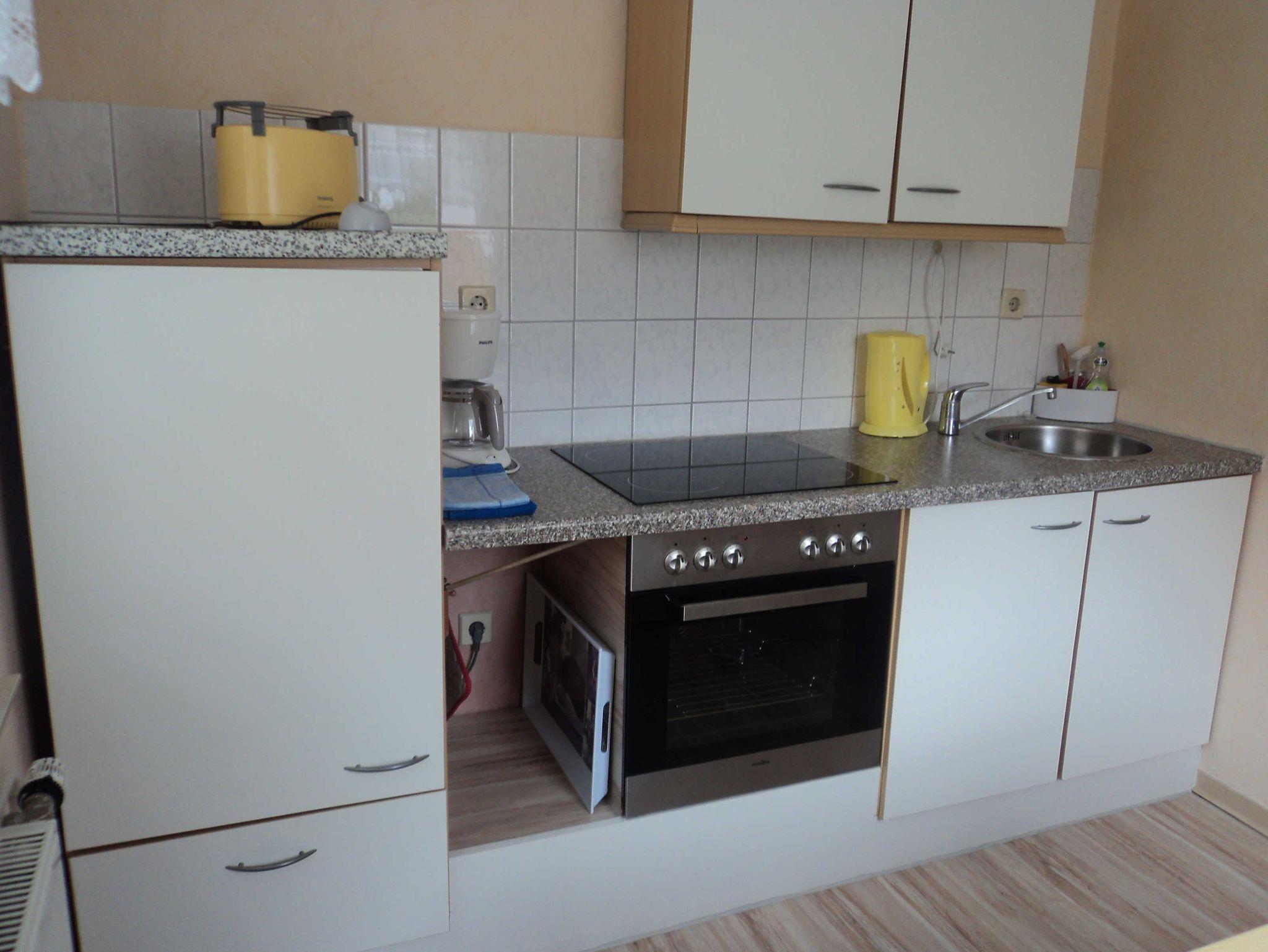 • Küche mit Kühlschrank, Herd mit Backofen, Wasserkocher, Toaster, Kaffeemaschine