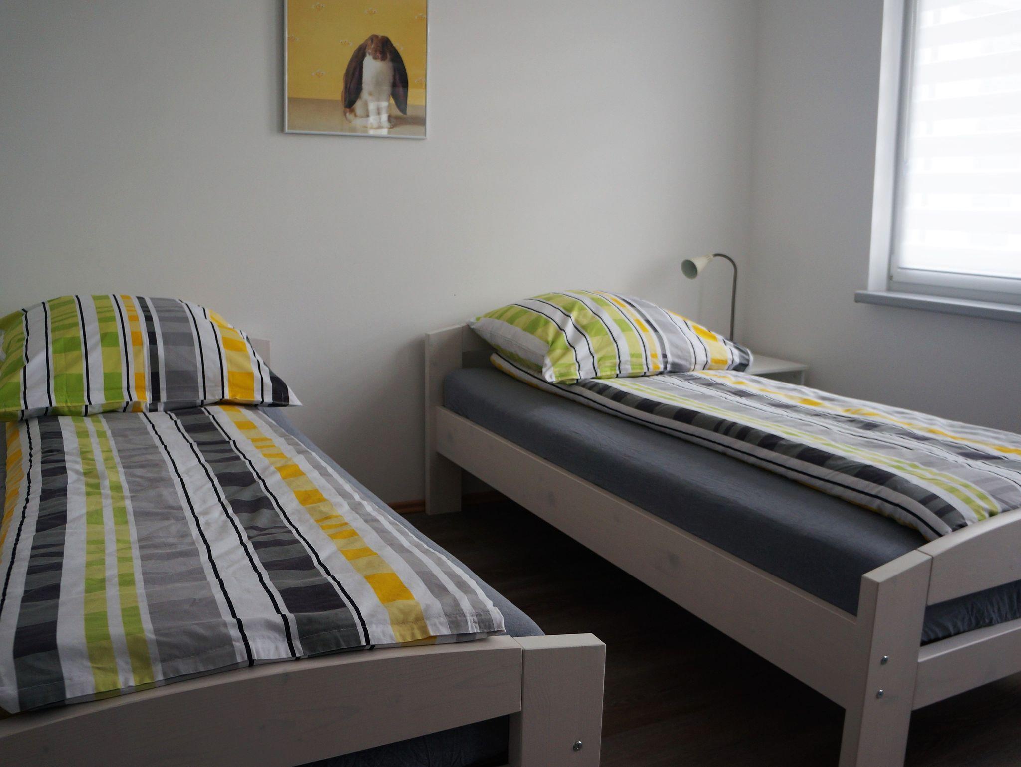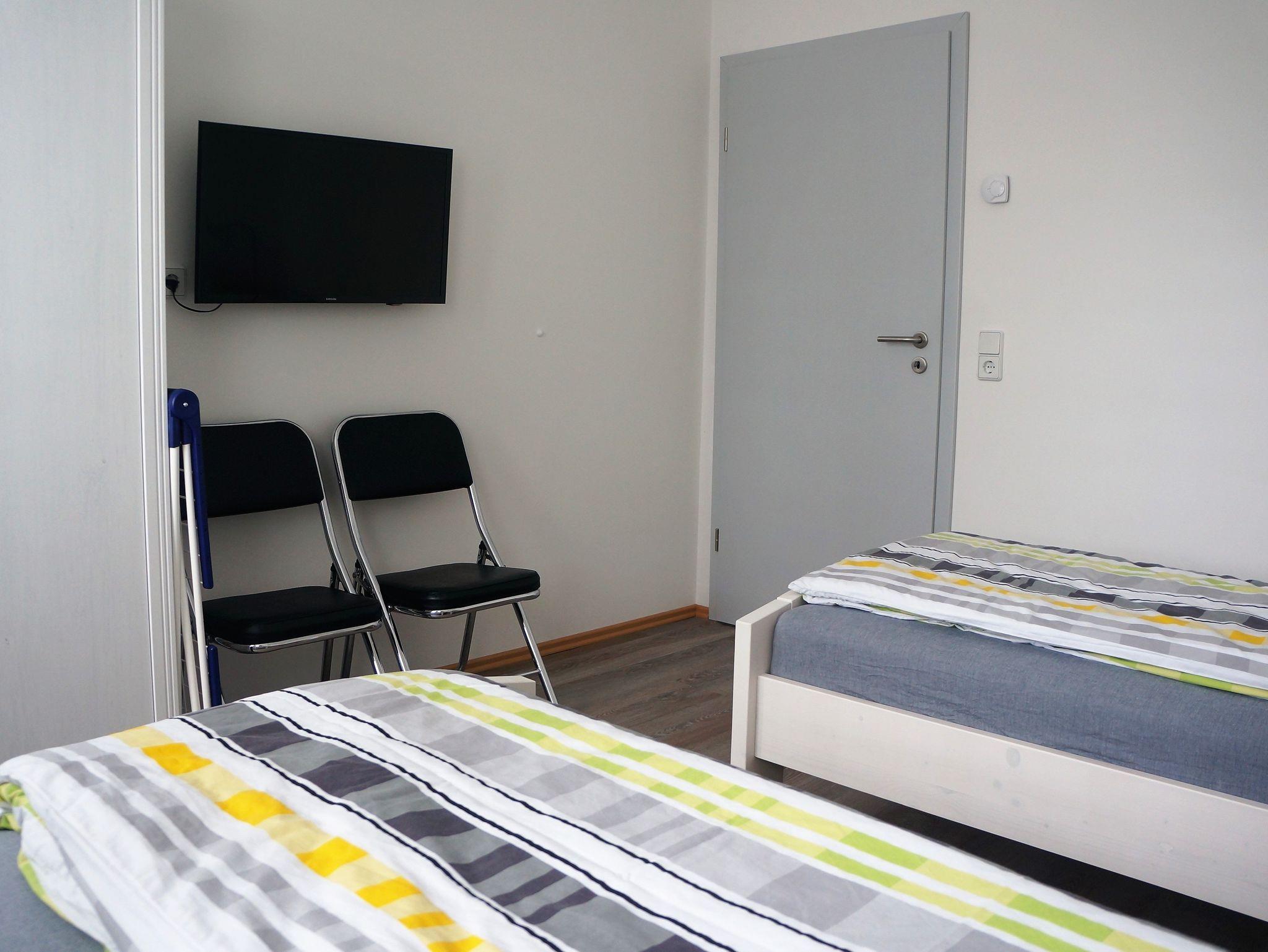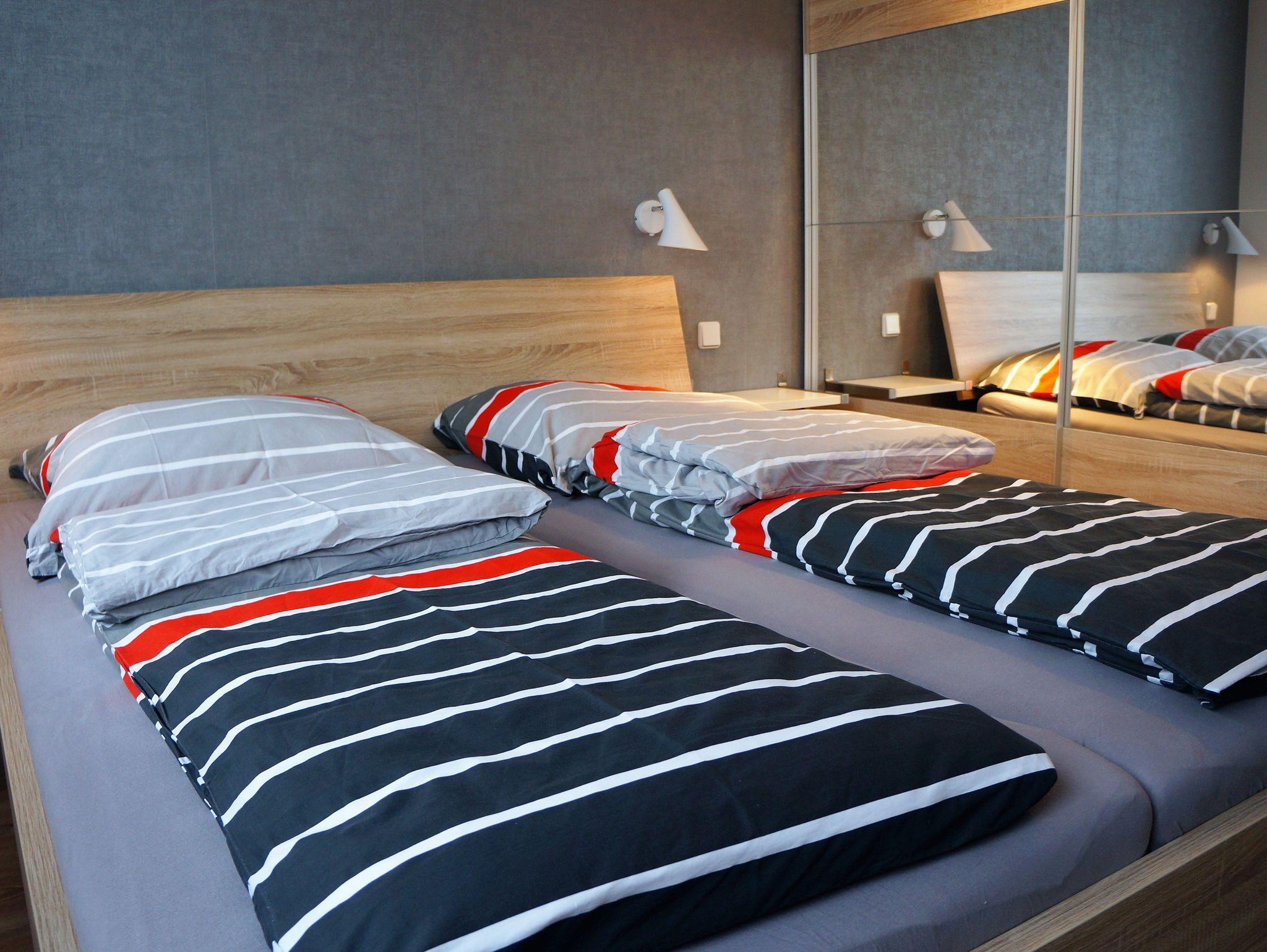 Zwei Schlafzimmer: ein Schlafzimmer mit Doppelbett, ein Schlafzimmer mit zwei Einzelbetten, sowie ein weiterer Flachbildfernseher.