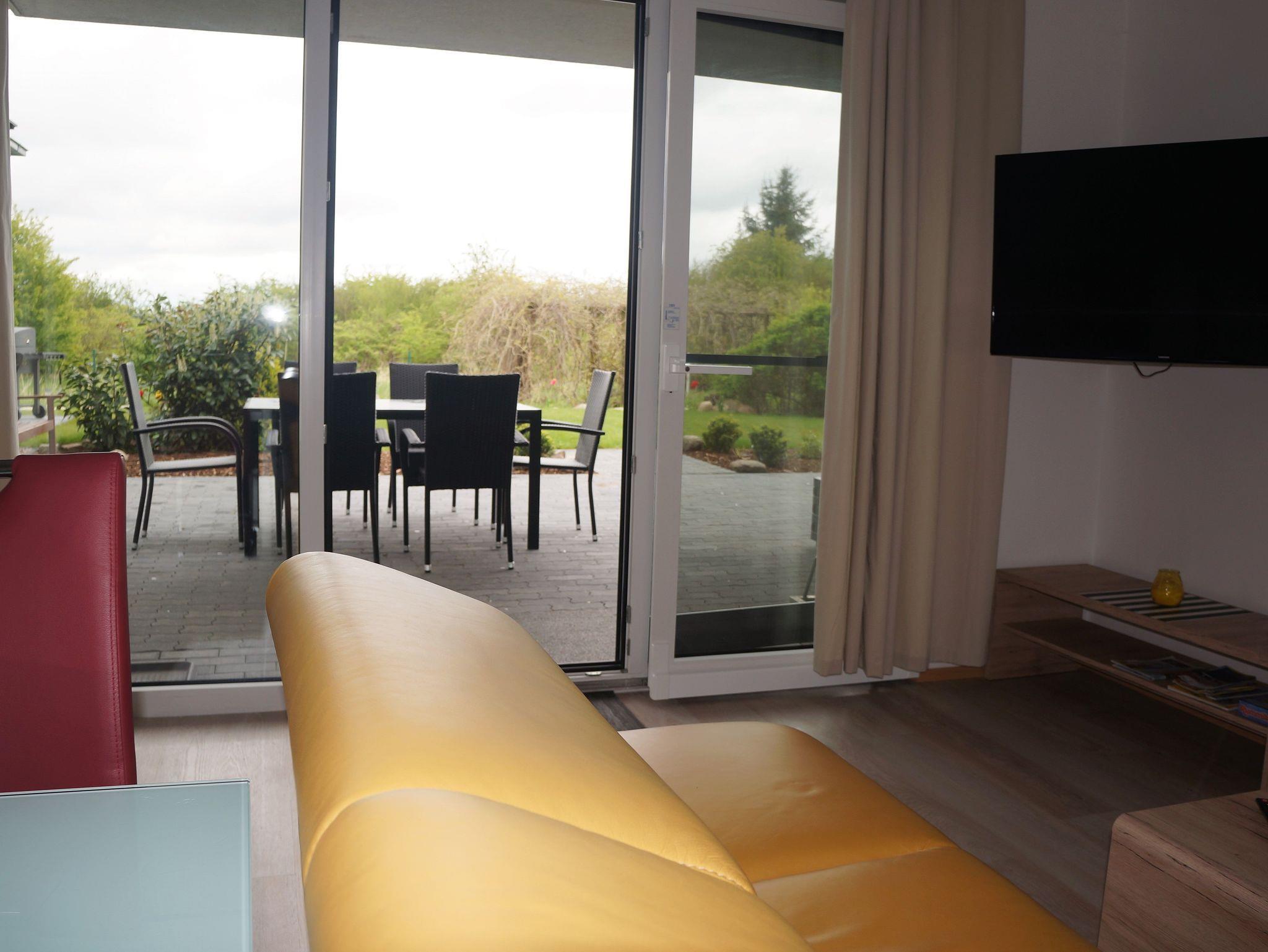 Der Wohnraum hat eine offene Küche, Esstisch, Flachbildfernseher, Sitzecke großem Ecksofa.