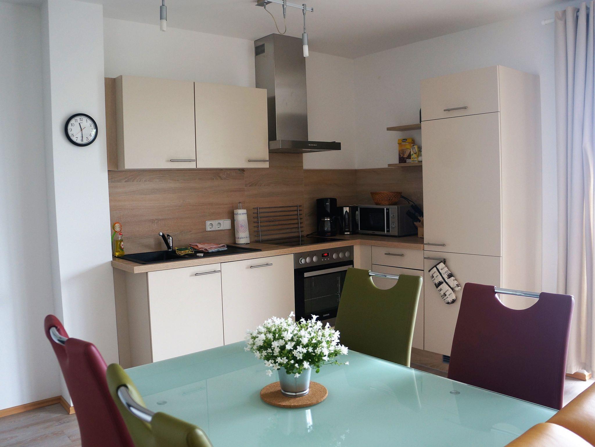 Die Küche ist mit Spülmaschine, Backofen, Cerankochfeld mit Dunstabzugshaube und Kühlschrank mit Gefrierfächern, Wasserkocher, Kaffeemaschine und Toaster ausgestattet.