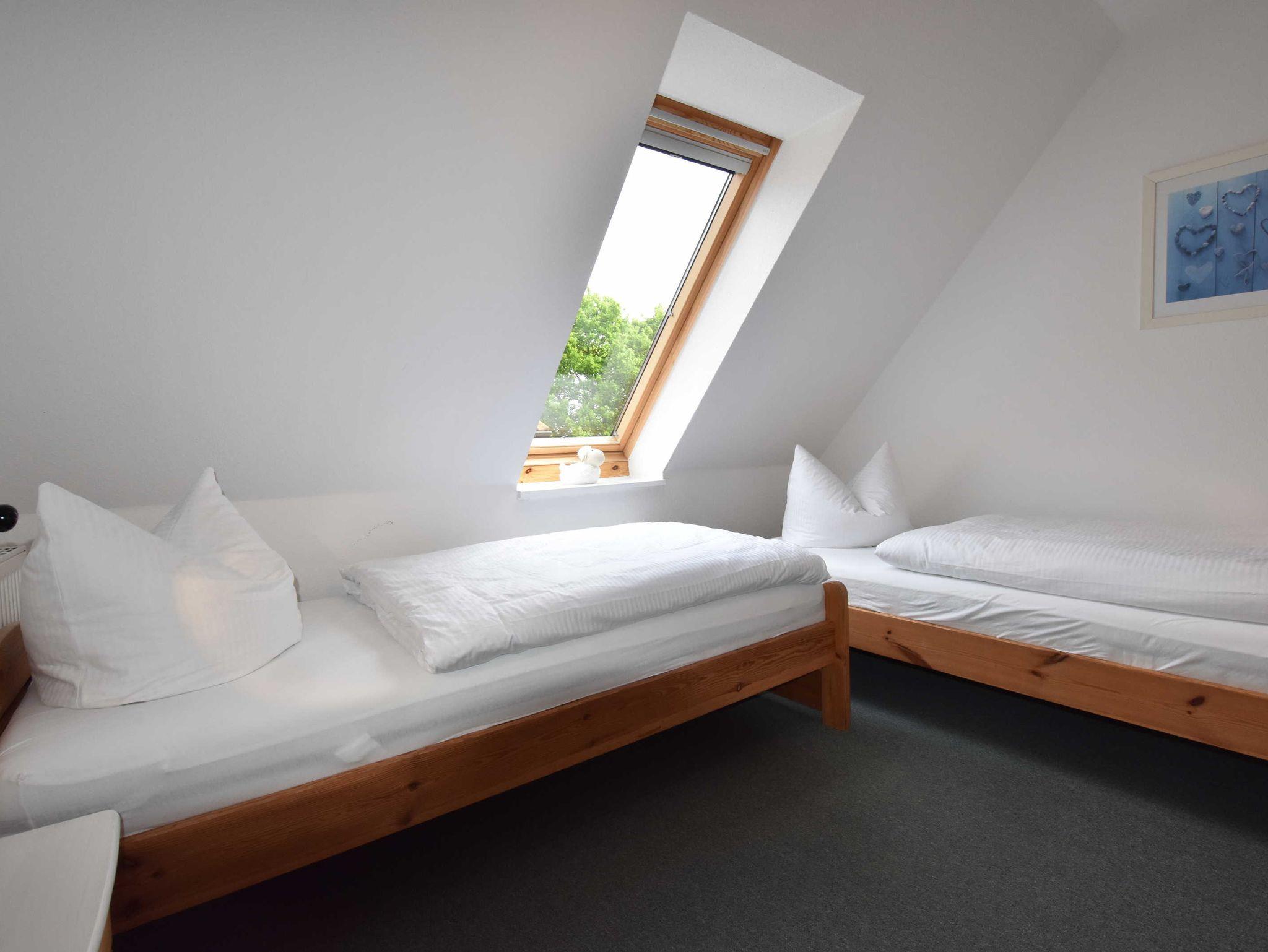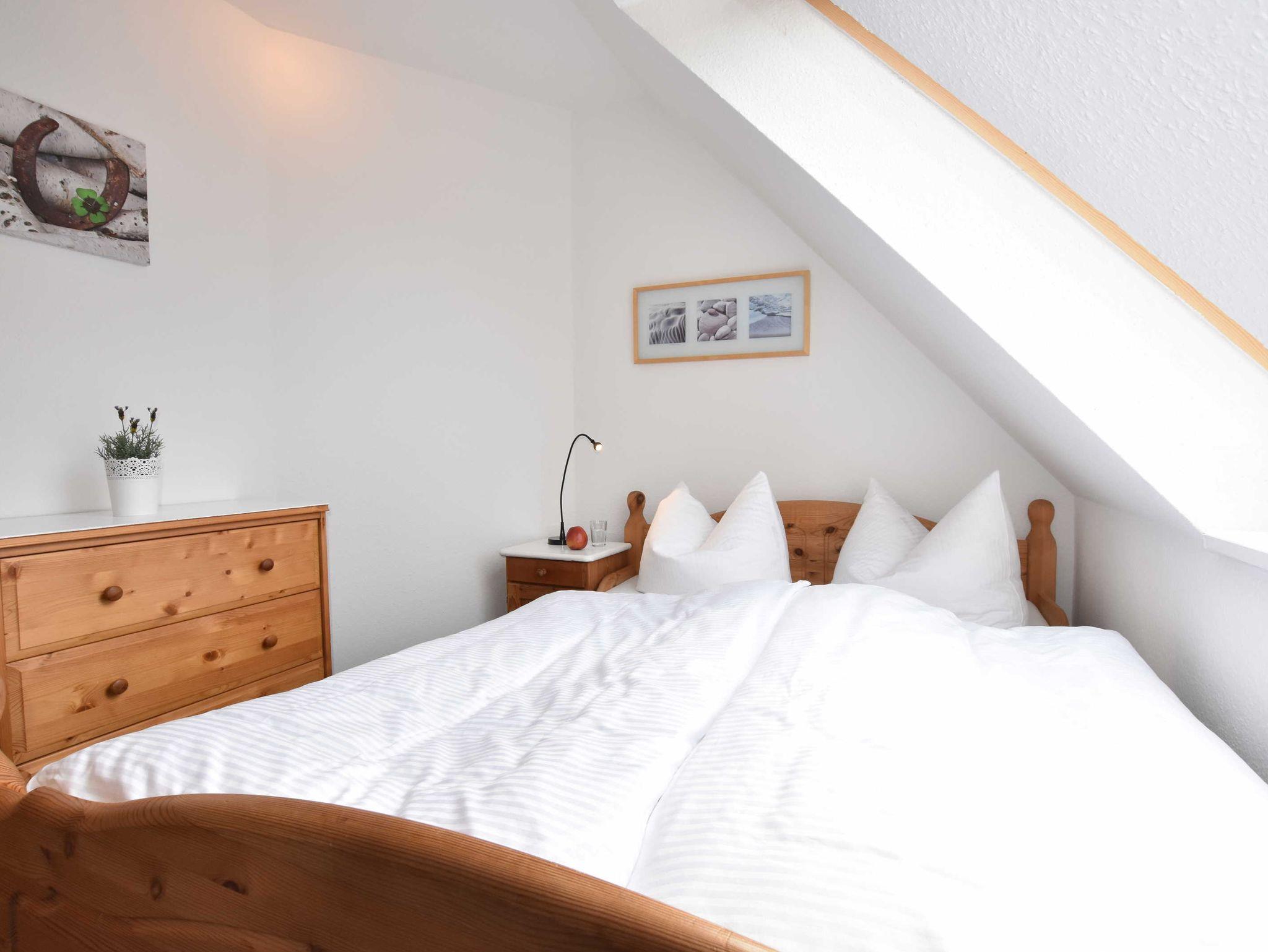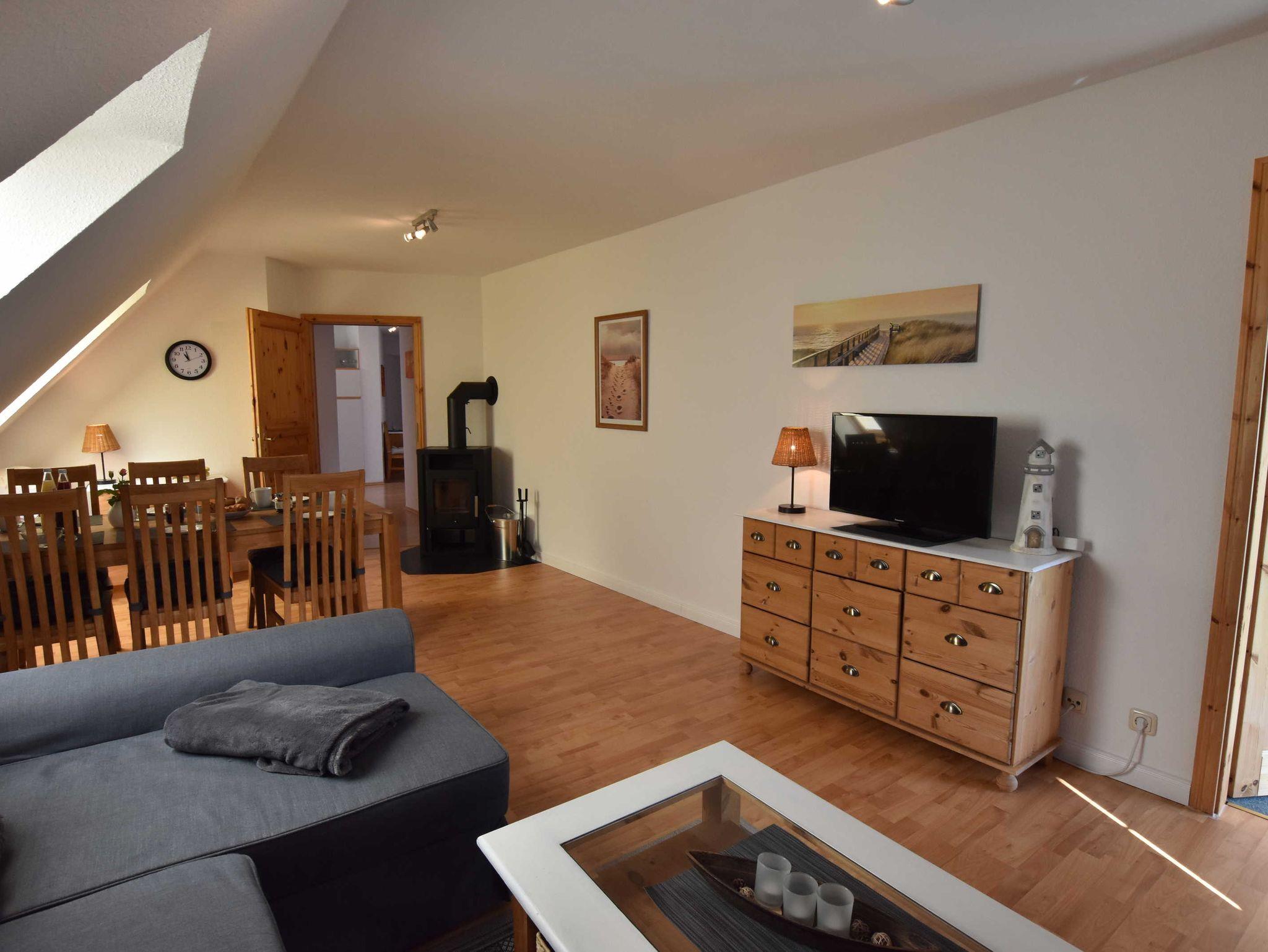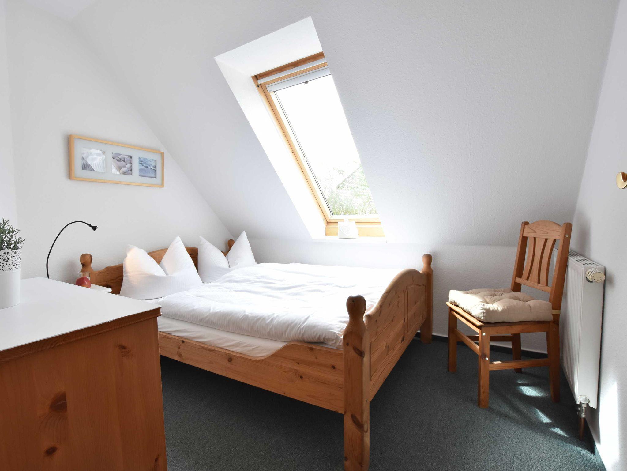 Ferienwohnung Nr. VI: 4- Raum -Fewo (6 Erw.+ 1 Kleinkind) im Dachgeschoss mit Kamin, Dachterrasse und herrlichem Blick auf das Wasser. Großzügiges Wohnzimmer mit Seeblick, Esstisch, Einbauküche (4- Platten- Herd, Backofen, Toaster, Wasserkocher, Kühlschrank mit Gefrierfach, Geschirrspüler), Wohnzimmer mit Kamin, Sitzecke und TV. Drei Schlafzimmer (1 x 1 Doppelbett 1,80 x 2,00m, 1 x 1 französischem Doppelbett (1,40 x 2,00m) sowie 1 x 2 Einzelbetten 0,90 x 2,00). Bad mit Dusche und zwei Waschbecken.