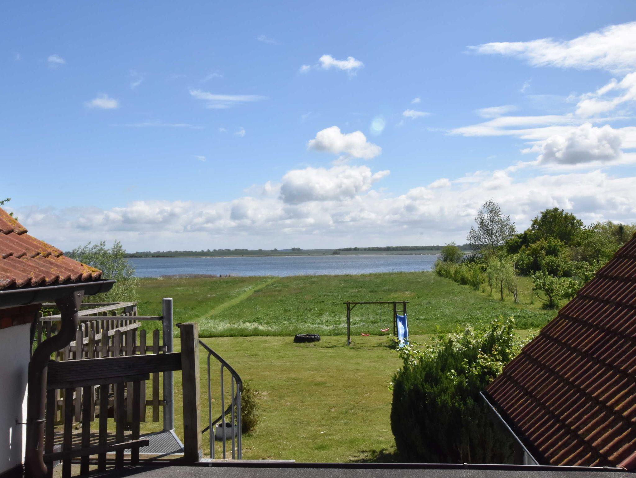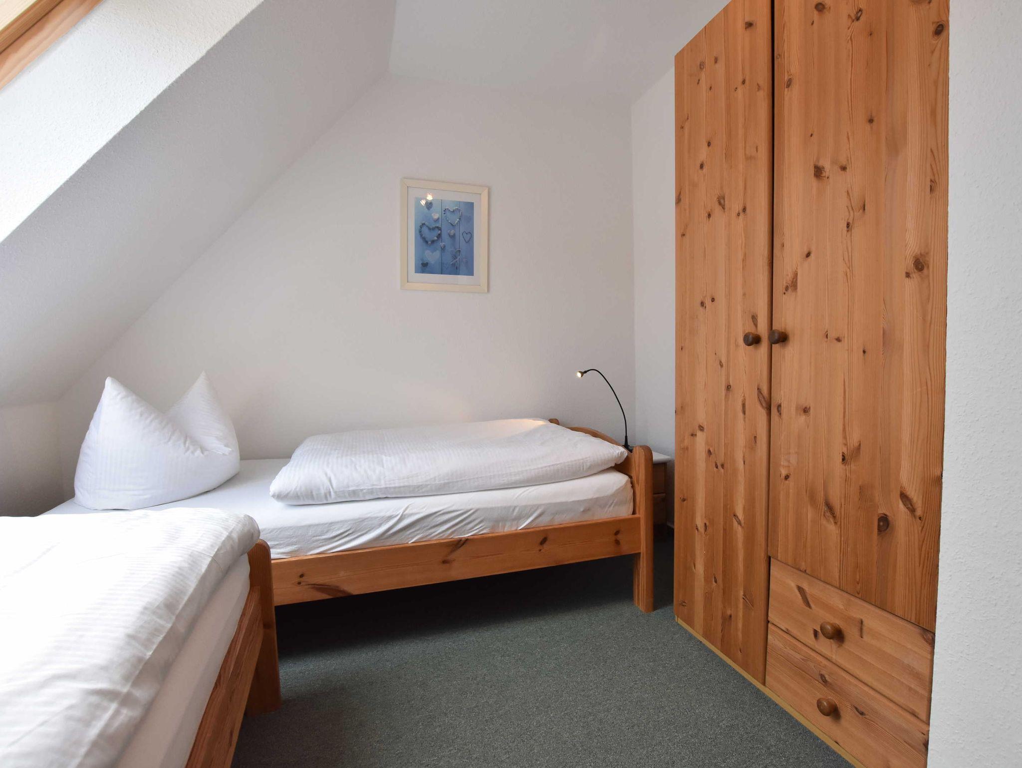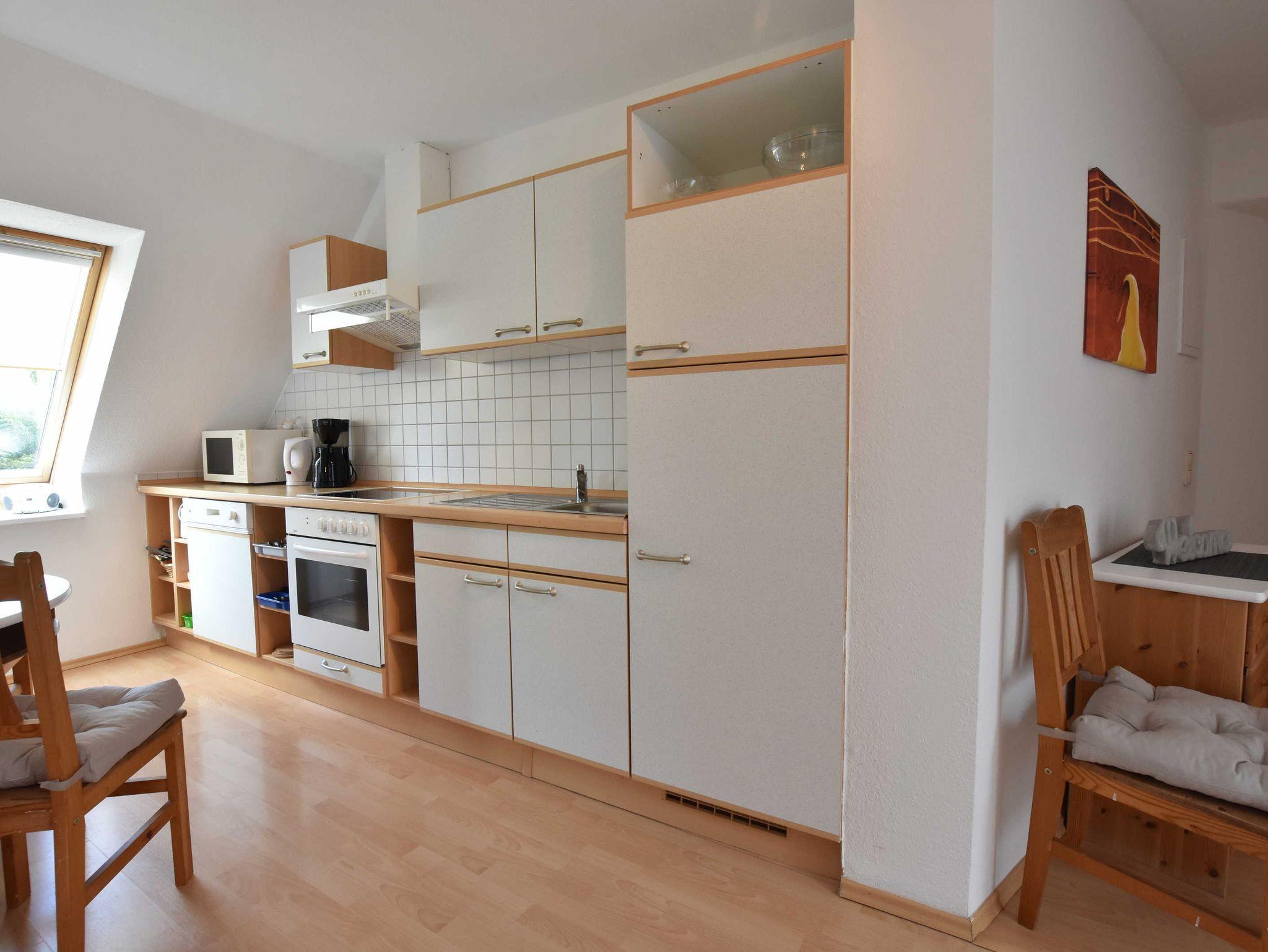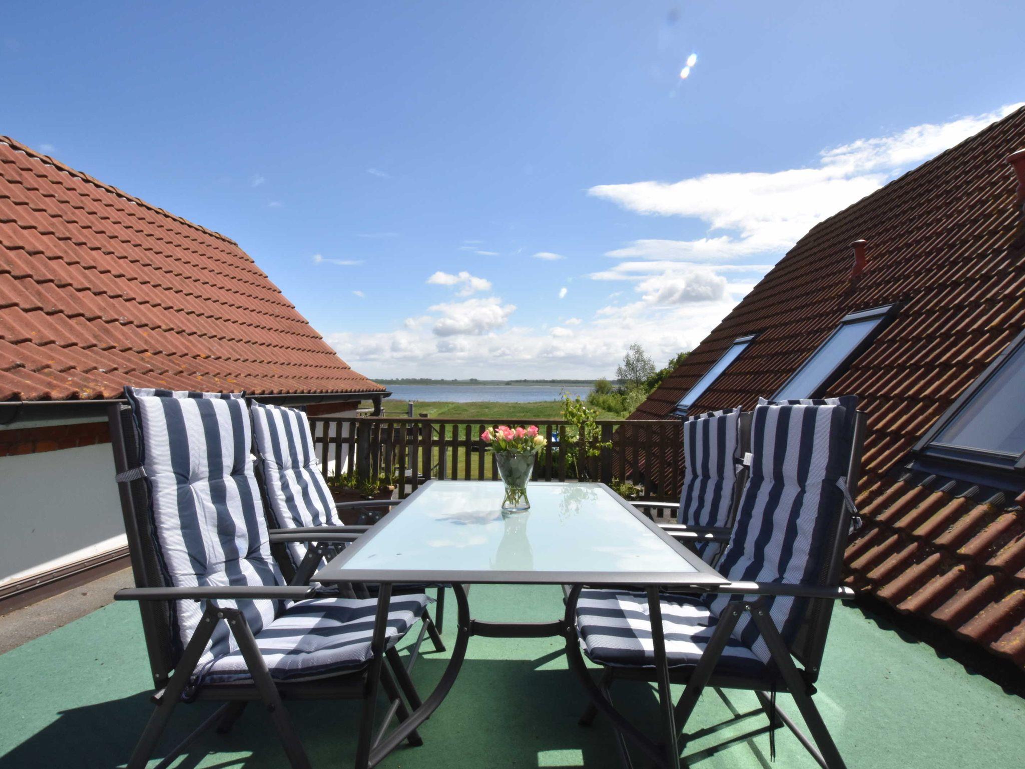 Ferienwohnung Nr. VI: 4- Raum -Fewo (6 Erw.+ 1 Kleinkind) im Dachgeschoss mit Kamin, Dachterrasse und herrlichem Blick auf das Wasser. Großzügiges Wohnzimmer mit Seeblick, Esstisch, Einbauküche (4- Platten- Herd, Backofen, Toaster, Wasserkocher, Kühlschrank mit Gefrierfach, Geschirrspüler), Wohnzimmer mit Kamin, Sitzecke und TV. Drei Schlafzimmer (1 x 1 Doppelbett 1,80 x 2,00m, 1 x 1 französischem Doppelbett (1,40 x 2,00m) sowie 1 x 2 Einzelbetten 0,90 x 2,00). Bad mit Dusche und zwei Waschbecken.