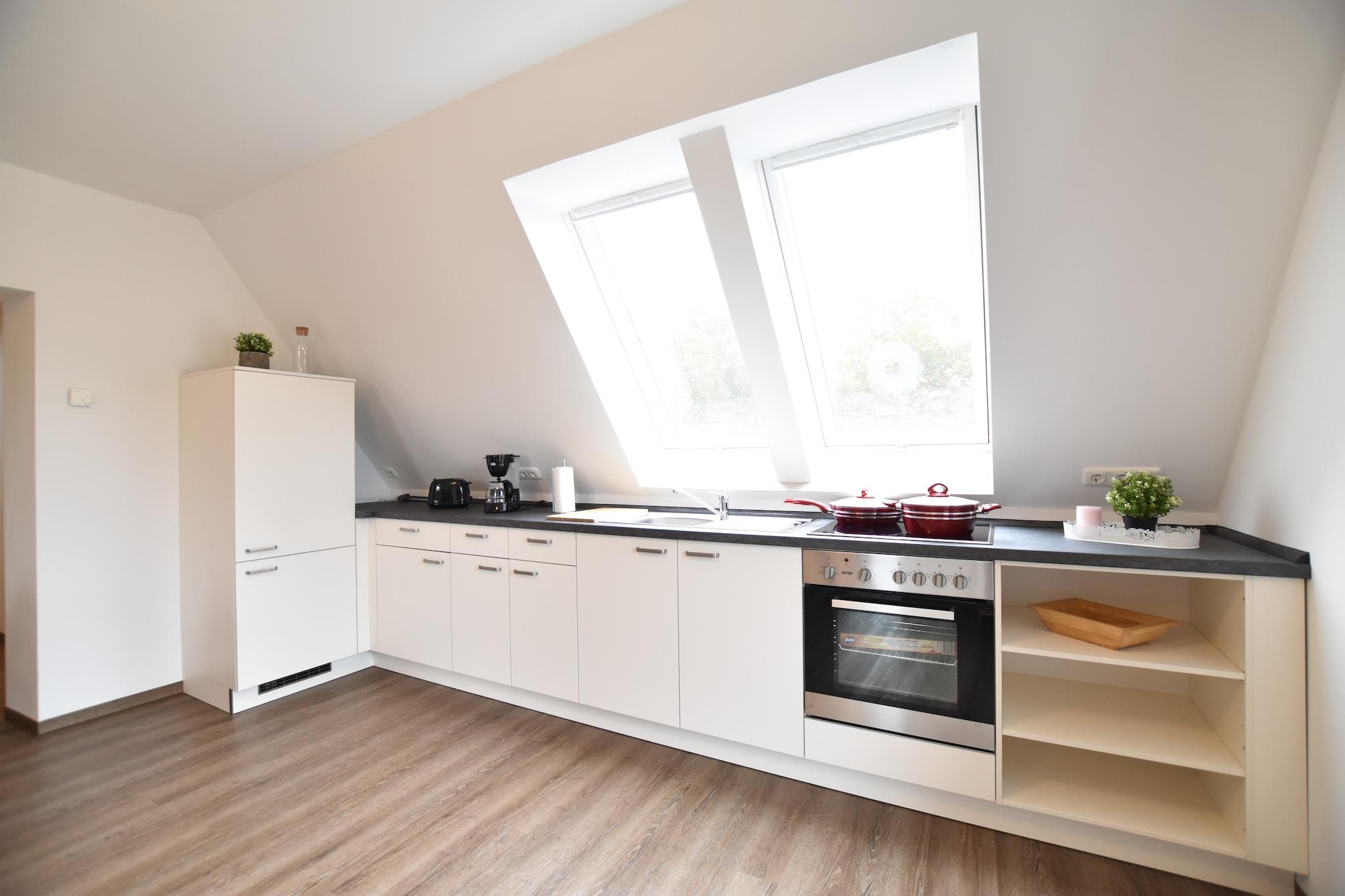 På 1. etage: (åbent køkken(elkedel, brødrister, komfur, kaffemaskine, ovn, køle-fryseskab), stue / spisestue(Fjernsyn, spisebord, sofahjørne), soveværelse(dobbeltseng), badeværelse(bruser, håndvask, toilet, føntørrer), balkon eller terrasse) Loft: (soveværelse(2x enkeltseng, Fjernsyn)) varme(gulvvarme), parkering