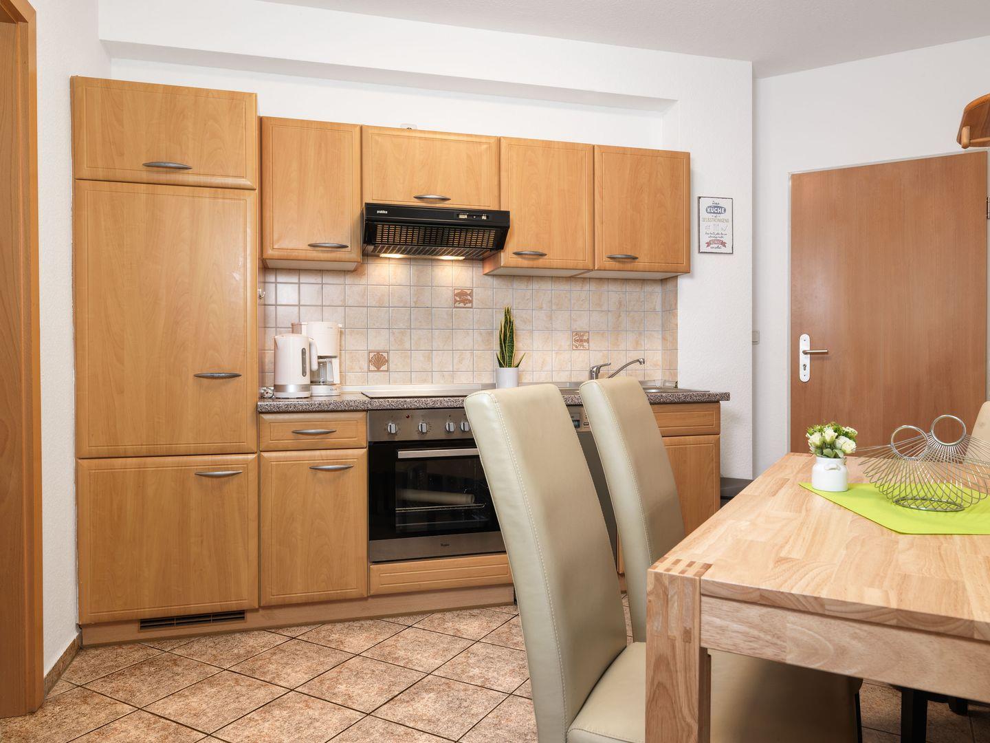 Herzlich Willkommen im Appartement "Steuerbord" - einer hübschen Erdgeschosswohnung mit ca. 59m² direkt am Strand vom Schwarzen Busch. Vorn befindet sich das Restaurant Traditionshaus Seeblick. Die Wohnung verfügt über ein Wohnzimmer mit großem TV und einem Schlafsofa sowie einem Kleiderschrank. Von hier aus gelangen Sie direkt auf die kleine Terrasse mit Gartenmöbeln, die an die Terrasse des Restaurants anschließt (Sichtschutzwand). Das Schlafzimmer ist mit einem Doppelbett, einer Schlafcouch und einem Schrank sowie einem großen TV ausgestattet und grenzt unmittelbar an die Terrasse des Restaurants. Für Ihre Unterhaltung steht eine Kompaktanlage inkl. USB-Anschluss zur Verfügung. Die große offene Küche mit Sitzplatz verfügt über einen Kühlschrank, Kaffeemaschine, Wasserkocher sowie einen Geschirrspüler. Das Bad ist mit Dusche, Badewanne und WC ausgestattet.